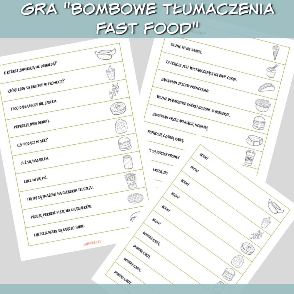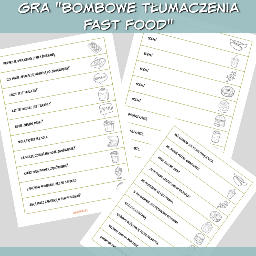 Bombowe tłumaczenia Fast Food to gra do druku, którą można wykorzystać do nauki każdego języka obcego. W grze znajdziesz zdania do przetłumaczenia na dowolny język związane z fast foodem, takie jak: Dawno nie jadłem tak pysznego burgera. Który masz numer zamówienia? Zamawiam zestaw promocyjny. Czy ten burger jest dostępny bez sera? Zdobywaj punkty losując karty ze zdaniami, ale uważaj, karta z napisem “BOOM” może pozbawić Cię wszystkich zdobytych punktów. Grę bombowe tłumaczenia Fast Food można również wykorzystać jako rozgrzewkę na początku zajęć wykorzystując tylko paski ze zdaniami.