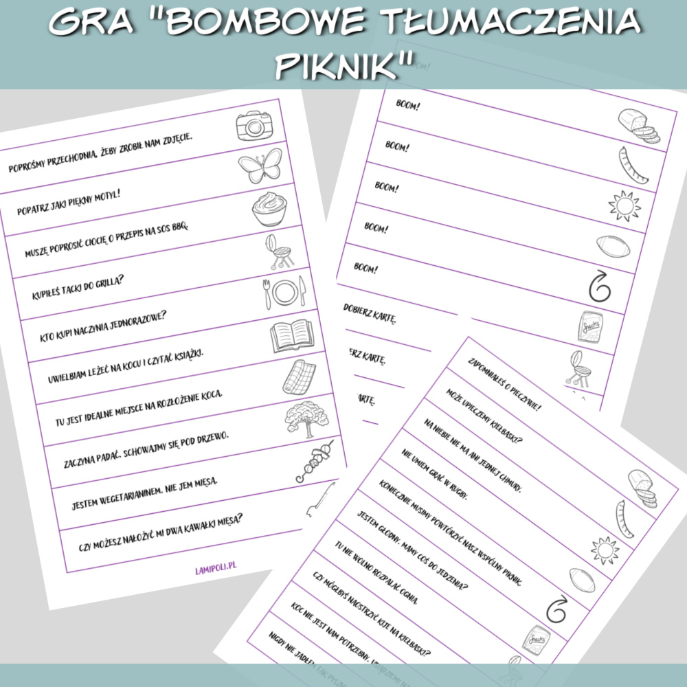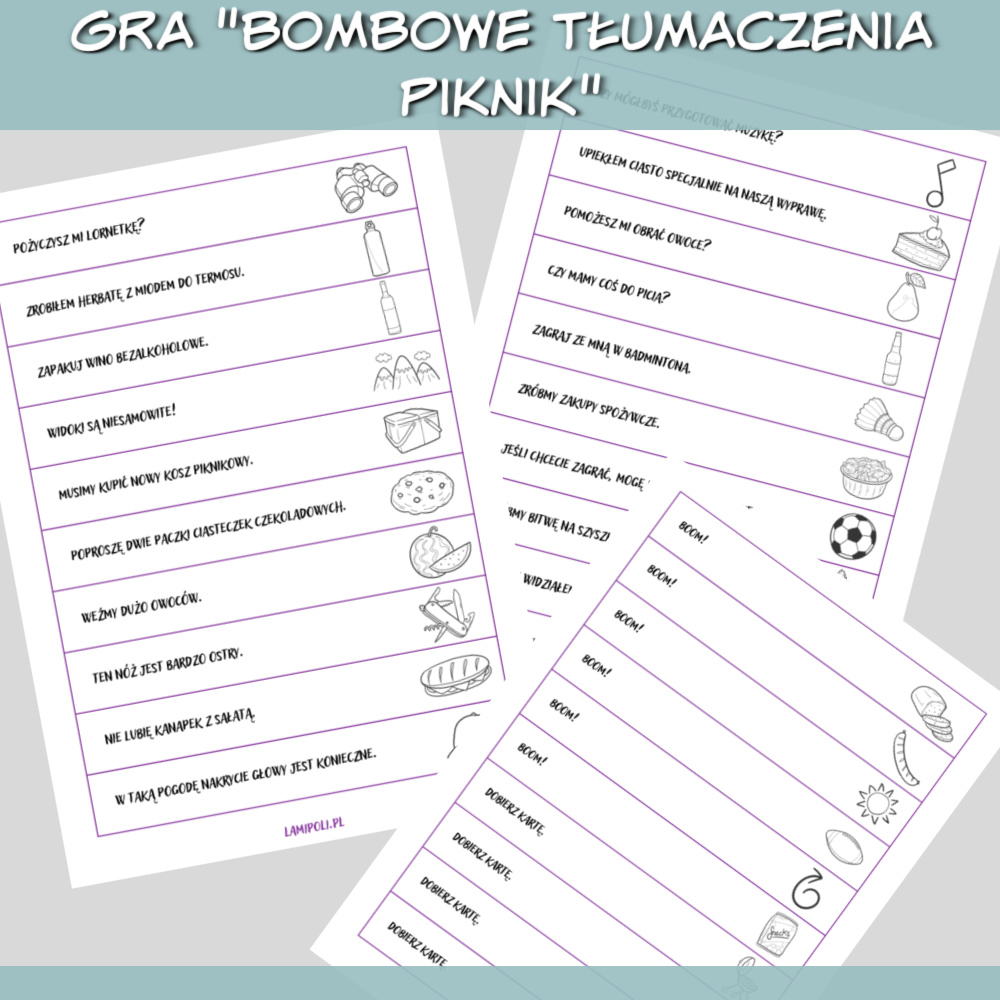 Bombowe tłumaczenia Piknik to gra do druku, którą można wykorzystać do nauki każdego języka obcego. W grze znajdziesz zdania do przetłumaczenia na dowolny język związane z piknikiem, takie jak: Kto kupi naczynia jednorazowe? Tu jest idealne miejsce na rozłożenie koca. Zapomniałeś o pieczywie! Popatrz jaki piękny motyl! Zdobywaj punkty losując karty ze zdaniami, ale uważaj, karta z napisem “BOOM” może pozbawić Cię wszystkich zdobytych punktów. Grę można również wykorzystać jako rozgrzewkę na początku zajęć wykorzystując tylko paski ze zdaniami.