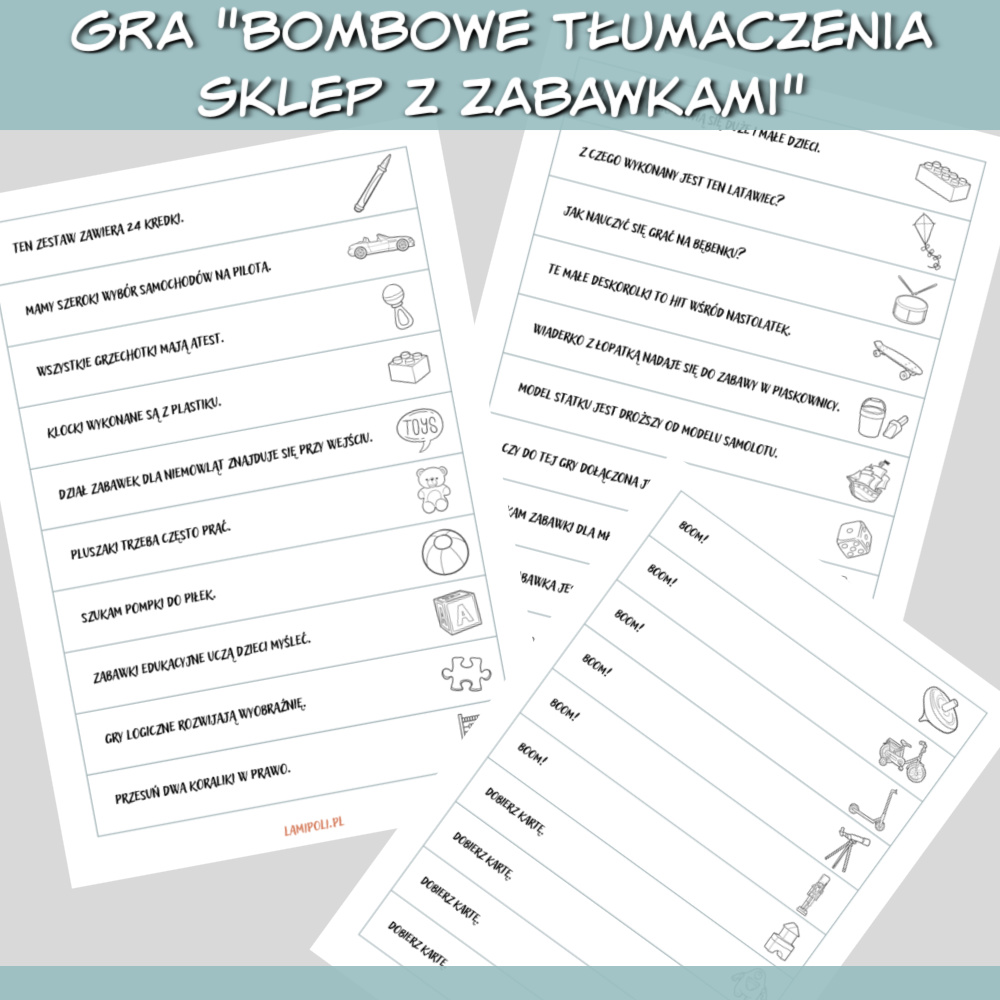 Bombowe tłumaczenia Sklep z zabawkami gra do druku, którą można wykorzystać do nauki każdego języka obcego. W grze znajdziesz zdania do przetłumaczenia na dowolny język związane ze sklepem z zabawkami, takie jak: Ten zestaw zawiera 24 kredki. Z czego wykonany jest ten latawiec? Czy do tej gry dołączona jest kostka? Czy ta zabawka jest bezpieczna dla dwulatka? Zdobywaj punkty losując karty ze zdaniami, ale uważaj, karta z napisem “BOOM” może pozbawić Cię wszystkich zdobytych punktów. Grę można również wykorzystać jako rozgrzewkę na początku zajęć wykorzystując tylko paski ze zdaniami.