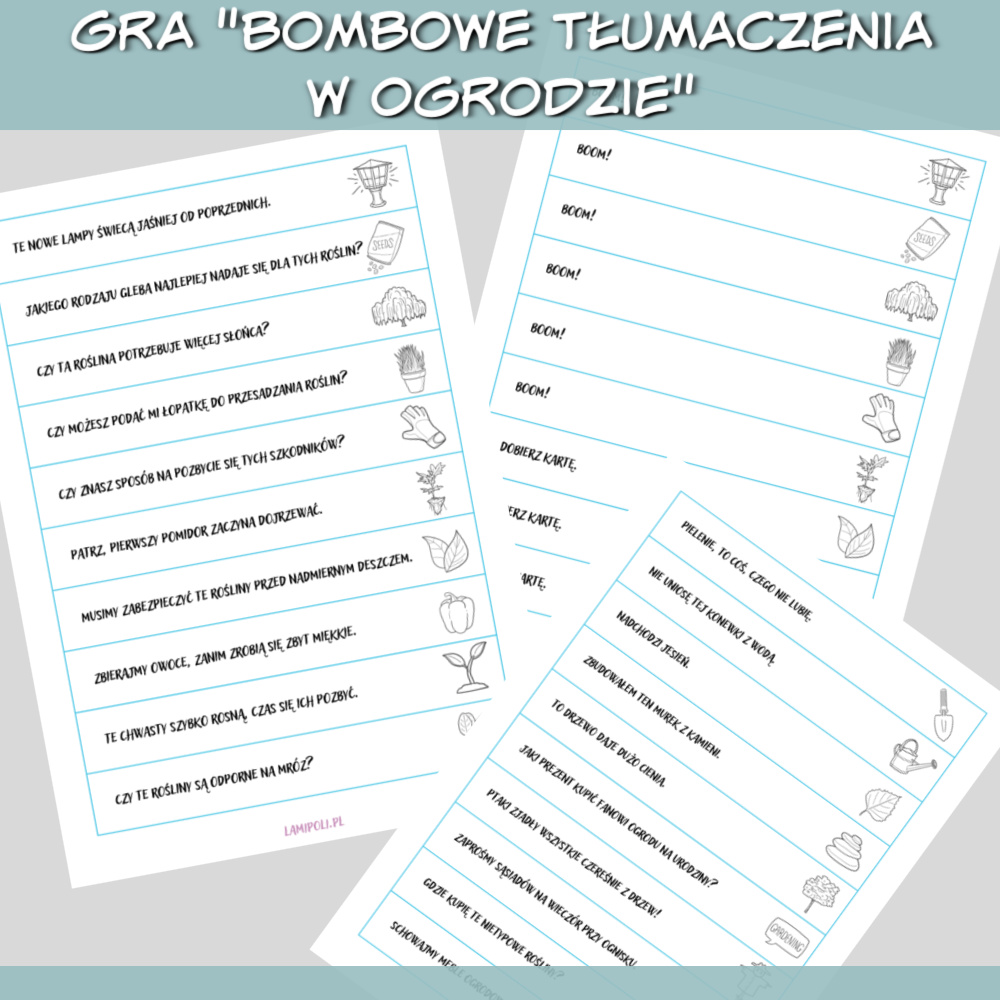 Nawożę rośliny raz w miesiącu. Moje ulubione kwiaty to stokrotki. Czy ta roślina potrzebuje więcej słońca? Ptaki zjadły wszystkie czereśnie z drzew! Te i inne zdania do przetłumaczenia znajdziesz w grze Bombowe tłumaczenia: W ogrodzie. Karty są w języku polskim, więc grę można wykorzystać do nauki każdego języka obcego. Zdobywaj punkty losując karty ze zdaniami, ale uważaj, karta z napisem “BOOM” może pozbawić Cię wszystkich zdobytych punktów. Grę można również wykorzystać jako rozgrzewkę na początku zajęć wykorzystując tylko paski ze zdaniami.