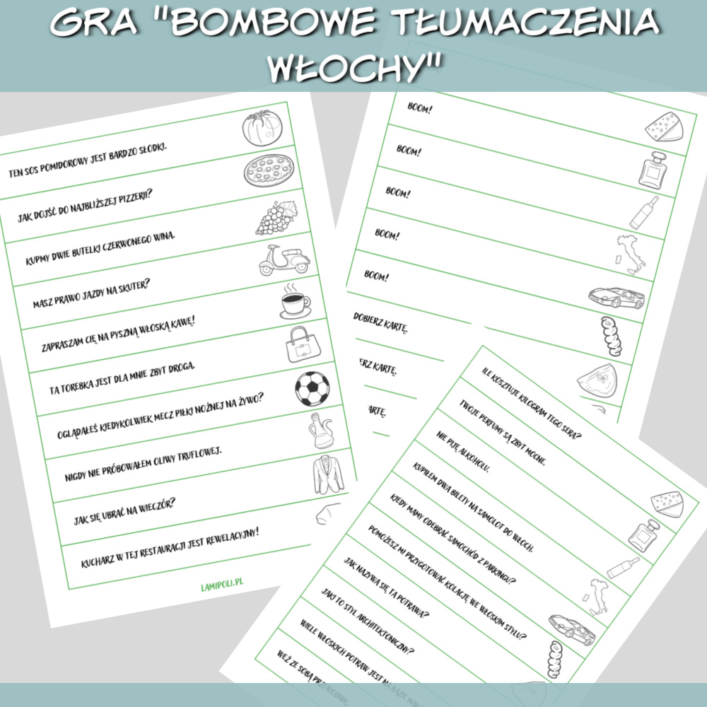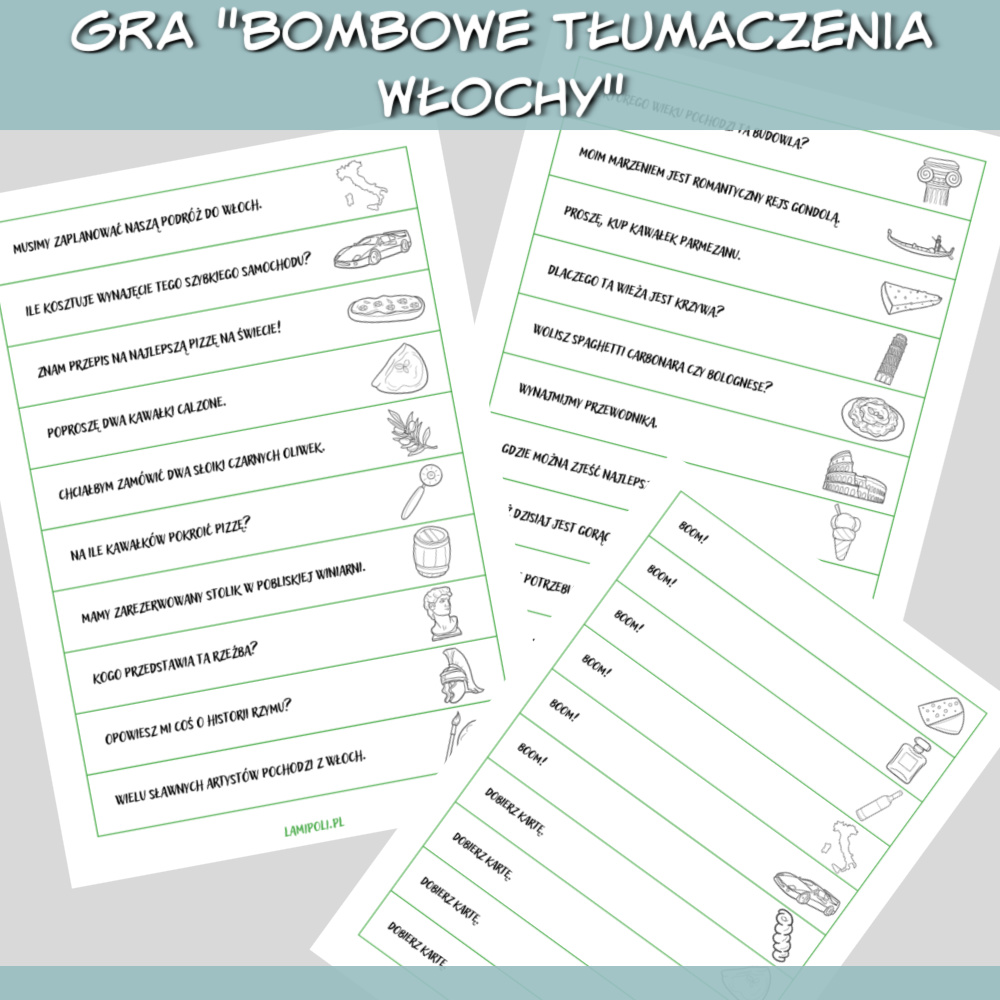 Bombowe tłumaczenia Włochy to gra do druku, którą można wykorzystać do nauki każdego języka obcego. W grze znajdziesz zdania do przetłumaczenia na dowolny język związane z Włochami, takie jak: Opowiesz mi coś o historii Rzymu? Proszę, kup kawałek parmezanu. Wynajmijmy przewodnika. Gdzie można zjeść najlepsze lody? Zdobywaj punkty losując karty ze zdaniami, ale uważaj, karta z napisem “BOOM” może pozbawić Cię wszystkich zdobytych punktów. Grę można również wykorzystać jako rozgrzewkę na początku zajęć wykorzystując tylko paski ze zdaniami.