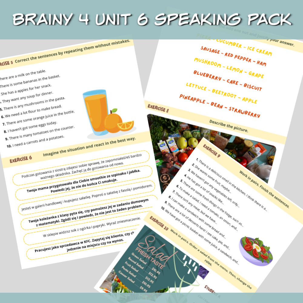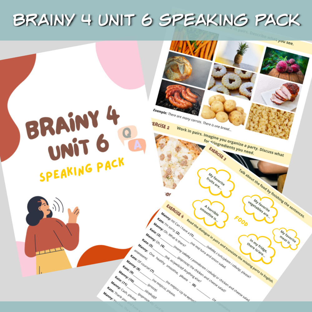 Brainy 4 Unit 6 Speaking Pack to zestaw materiałów stworzony z myślą o skutecznej powtórce materiału z Unitu 6 podręcznika Brainy 4, z naciskiem na rozwijanie umiejętności mówienia. Znajdziesz w nim różnorodne zadania, które pomogą Twoim uczniom utrwalić słownictwo, struktury gramatyczne oraz pewność w komunikacji w języku angielskim.