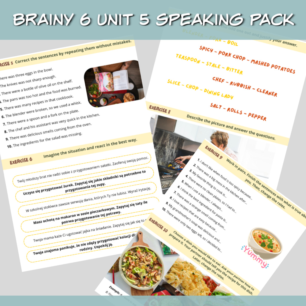 Brainy 6 Unit 5 Speaking Pack to zestaw materiałów stworzony z myślą o skutecznej powtórce materiału z Unitu 5 podręcznika Brainy 6, z naciskiem na rozwijanie umiejętności mówienia. Znajdziesz w nim różnorodne zadania, które pomogą Twoim uczniom utrwalić słownictwo, struktury gramatyczne oraz pewność w komunikacji w języku angielskim.