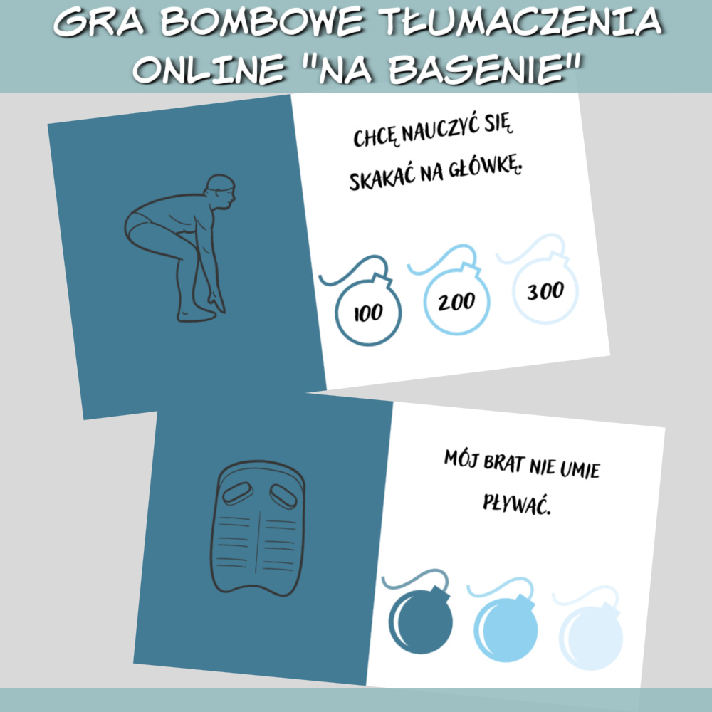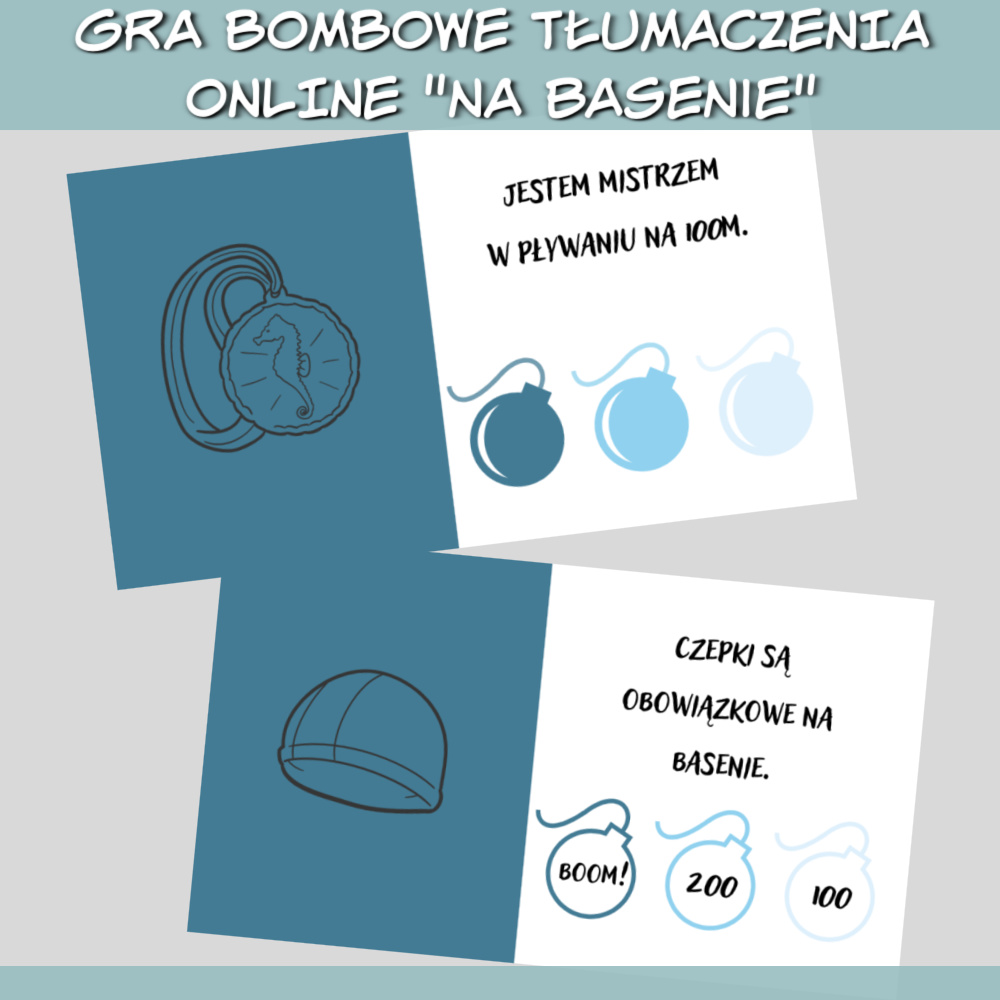Gra online Bombowe tłumaczenia Na basenie to zestaw gier w formie prezentacji, który można wykorzystać podczas nauki każdego języka obcego na zajęciach online lub stacjonarnie, wyświetlając prezentacje na ekranie. W grze znajdziesz zdania do przetłumaczenia na dowolny język związane z basenem, takie jak: Jestem kiepski w nurkowaniu. Nie mam dzisiaj ochoty iść na basen. Moje klapki są za duże. Chodzę na basen dwa razy w tygodniu. Zdobywaj punkty tłumacząc zdania i wybierając jedną z trzech bomb, ale uważaj, niektóre bomby mogą pozbawić Cię punktów! Gra online Bombowe tłumaczenia na basenie sprawdzi się najlepiej na zajęciach z młodzieżą i dorosłymi.