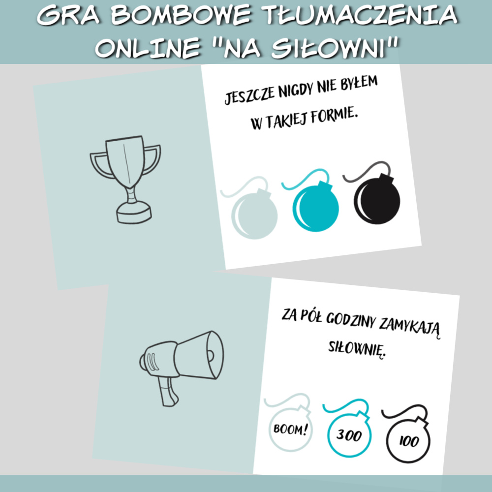 Gra online Bombowe tłumaczenia Na siłowni to zestaw gier w formie prezentacji, który można wykorzystać podczas nauki każdego języka obcego na zajęciach online lub stacjonarnie, wyświetlając prezentacje na ekranie. W grze znajdziesz zdania do przetłumaczenia na dowolny język związane z siłownią, takie jak: Już nie zdążę dzisiaj pójść na siłownię. Po treningu zawsze się rozciągam. Nie stać mnie na treningi personalne. Zrób jeszcze trzy powtórzenia. Zdobywaj punkty tłumacząc zdania i wybierając jedną z trzech bomb, ale uważaj, niektóre bomby mogą pozbawić Cię punktów! Gra sprawdzi się najlepiej na zajęciach z młodzieżą i dorosłymi.