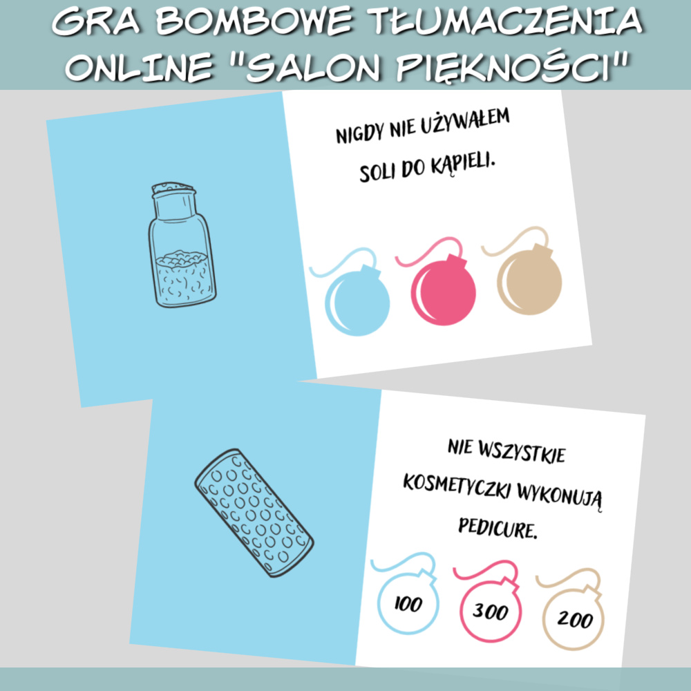 Gra online Bombowe tłumaczenia Salon piękności to zestaw gier w formie prezentacji, który można wykorzystać podczas nauki każdego języka obcego na zajęciach online lub stacjonarnie, wyświetlając prezentacje na ekranie. W grze znajdziesz zdania do przetłumaczenia na dowolny język związane z salonem piękności, takie jak: Uwielbiam te perfumy! Jakie są nowe zabiegi na włosy? Marzę o weekendzie w SPA. Nie podobają mi się powiększone usta. Zdobywaj punkty tłumacząc zdania i wybierając jedną z trzech bomb, ale uważaj, niektóre bomby mogą pozbawić Cię punktów! Gra online Bombowe tłumaczenia Salon piękności sprawdzi się najlepiej na zajęciach z młodzieżą i dorosłymi.