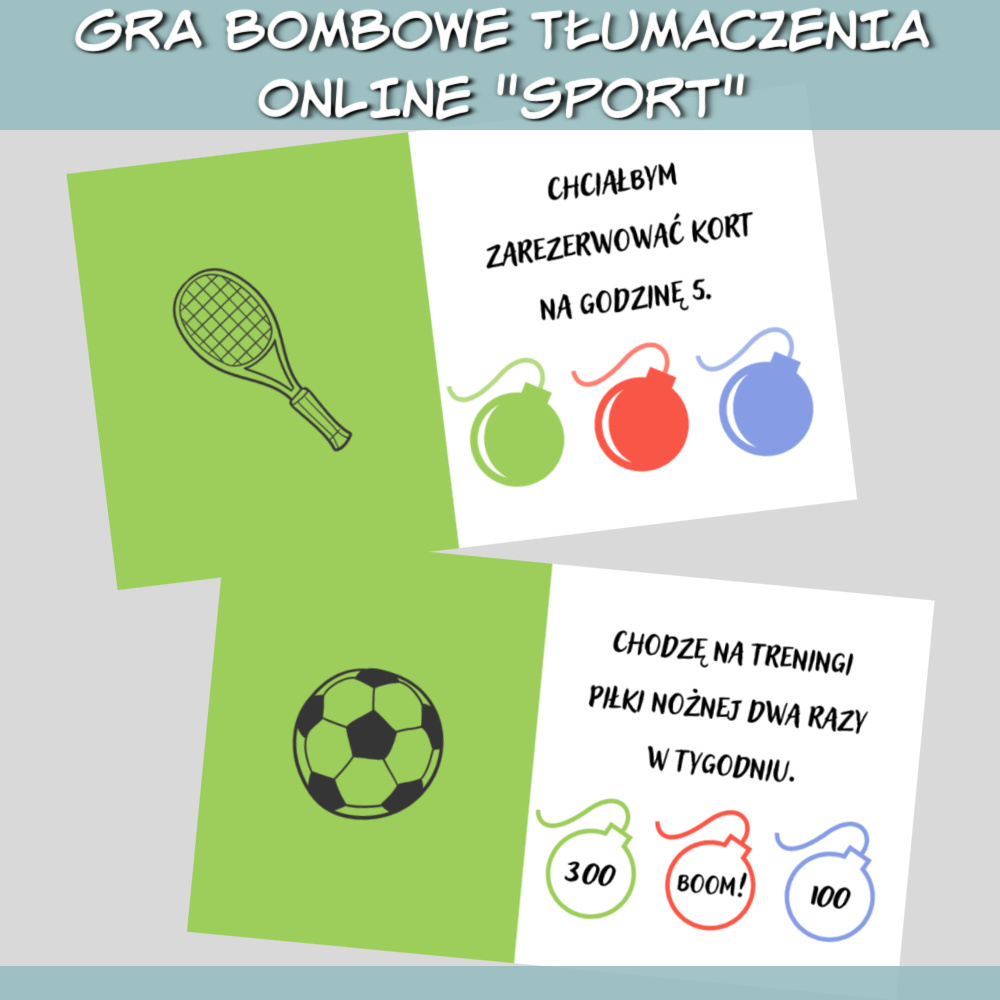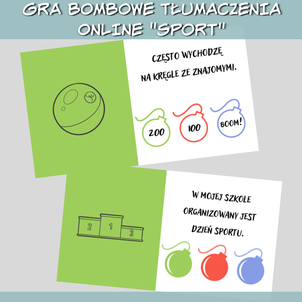 Gra online Bombowe tłumaczenia Sport to zestaw gier w formie prezentacji, który można wykorzystać podczas nauki każdego języka obcego na zajęciach online lub stacjonarnie, wyświetlając prezentacje na ekranie. W grze znajdziesz zdania do przetłumaczenia na dowolny język związane ze sportem, takie jak: Jestem w tym mistrzem! Może pójdziemy wieczorem na kręgle? Znowu zgubiłeś piłkę! Zdobywaj punkty tłumacząc zdania i wybierając jedną z trzech bomb, ale uważaj, niektóre bomby mogą pozbawić Cię punktów! Gra online Bombowe tłumaczenia sprawdzi się najlepiej na zajęciach z młodzieżą i dorosłymi.