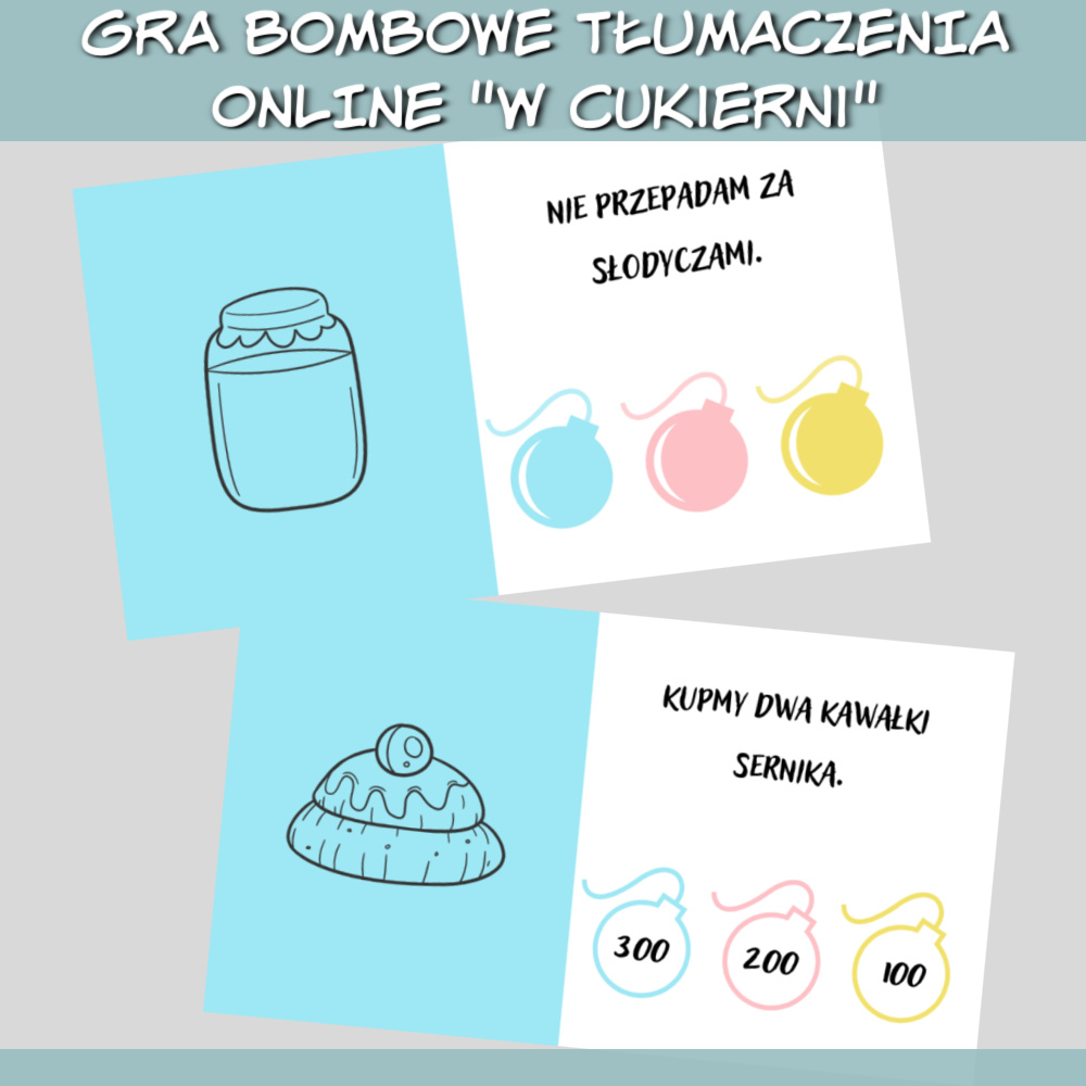 Gra online Bombowe tłumaczenia W cukierni to zestaw gier w formie prezentacji, który można wykorzystać podczas nauki każdego języka obcego na zajęciach online lub stacjonarnie, wyświetlając prezentacje na ekranie. W grze znajdziesz zdania do przetłumaczenia na dowolny język związane z cukiernią, takie jak: Tu jest ogromny wybór niesamowitych deserów. Co napisać na torcie urodzinowym? Czy te ciastka są bezglutenowe? Kupmy dwa kawałki sernika. Zdobywaj punkty tłumacząc zdania i wybierając jedną z trzech bomb, ale uważaj, niektóre bomby mogą pozbawić Cię punktów! Gra online Bombowe tłumaczenia W cukierni sprawdzi się najlepiej na zajęciach z młodzieżą i dorosłymi.