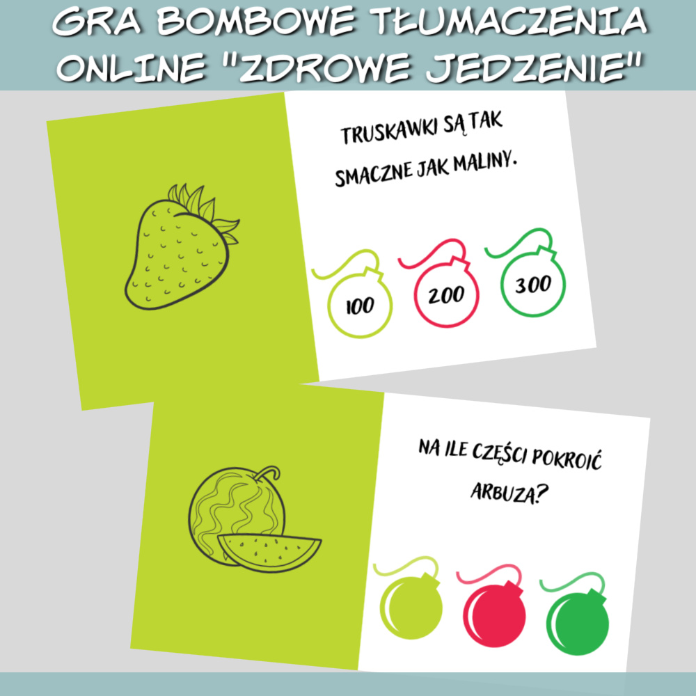Gra online Bombowe tłumaczenia Zdrowe jedzenie to zestaw gier w formie prezentacji, który można wykorzystać podczas nauki każdego języka obcego na zajęciach online lub stacjonarnie, wyświetlając prezentacje na ekranie. W grze znajdziesz zdania do przetłumaczenia na dowolny język związane ze zdrowym jedzeniem, takie jak: Zetrzyj na tarce dwie marchewki. Ile jabłek obrać? Pokrój tę brzoskwinie w kostkę. Wczoraj byłem u dietetyka. Nie potrafię przekonać się do warzyw. Zdobywaj punkty tłumacząc zdania i wybierając jedną z trzech bomb, ale uważaj, niektóre bomby mogą pozbawić Cię punktów! Gra online Bombowe tłumaczenia Zdrowe jedzenie sprawdzi się najlepiej na zajęciach z młodzieżą i dorosłymi.