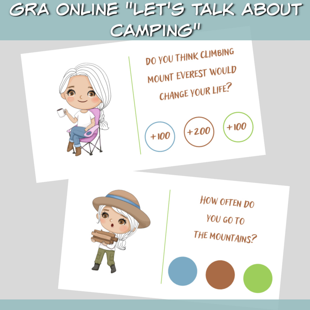 Gra online Let’s talk about camping to fajna opcja na konwersacje w języku angielskim. W zestawie online Let’s talk about camping znajdziesz dwie gry z grafikami nawiązującymi do campingu. Zdobywaj punkty odpowiadając na pytania i wybierając jedno z trzech kolorowych kółek. Osoba, której uda się zdobyć najwięcej punktów, wygrywa!