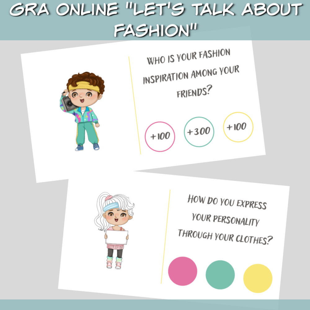 Gra online Let’s talk about fashion to fajna opcja na konwersacje w języku angielskim. W zestawie online Let’s talk about fashion znajdziesz dwie gry z kolorowymi grafikami. Zdobywaj punkty odpowiadając na pytania i wybierając jedno z trzech kolorowych kółek. Osoba, której uda się zdobyć najwięcej punktów, wygrywa!