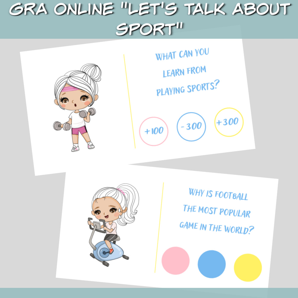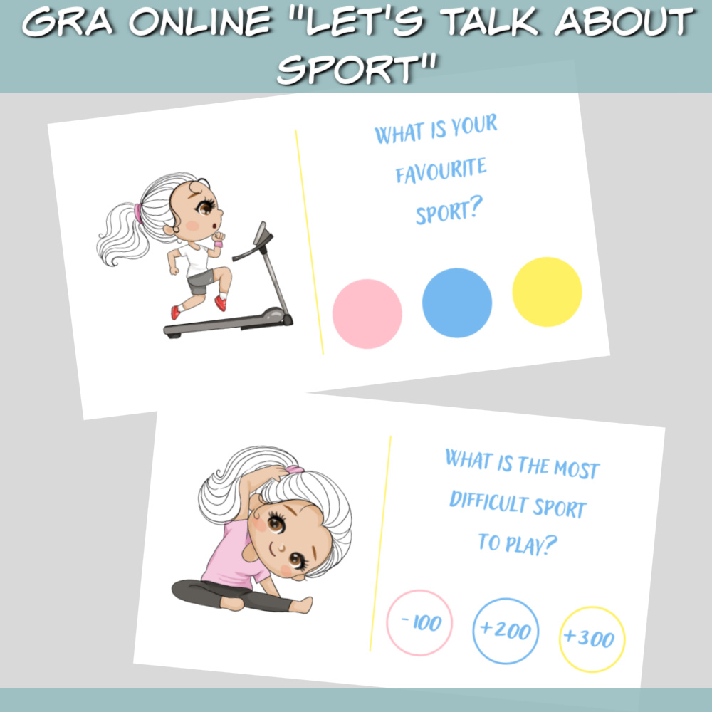 Gra online Let’s talk about sport to fajna opcja na konwersacje w języku angielskim. W zestawie online Let’s talk about sport znajdziesz dwie gry z grafikami nawiązującymi do tematu sportu. Zdobywaj punkty odpowiadając na pytania i wybierając jedno z trzech kolorowych kółek. Osoba, której uda się zdobyć najwięcej punktów, wygrywa!