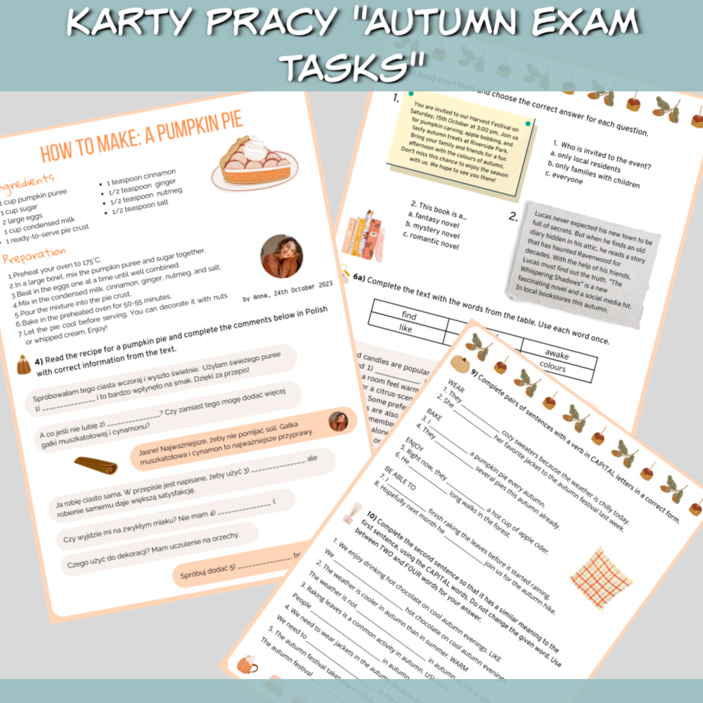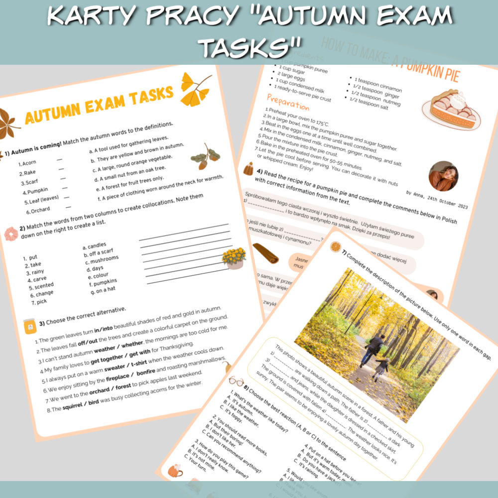 Karty pracy Autumn Exam Tasks to zestaw na zajęcia z języka angielskiego, który idealnie sprawdzi się zarówno z uczniami przygotowującymi się do egzaminu ósmoklasisty, jak i z uczniami szkoły średniej. W zestawie znajdziemy czytanki, zadania sprawdzające znajomość słownictwa i zwrotów oraz zadania sprawdzające znajomość gramatyki. Wszystko w tematyce jesieni.
