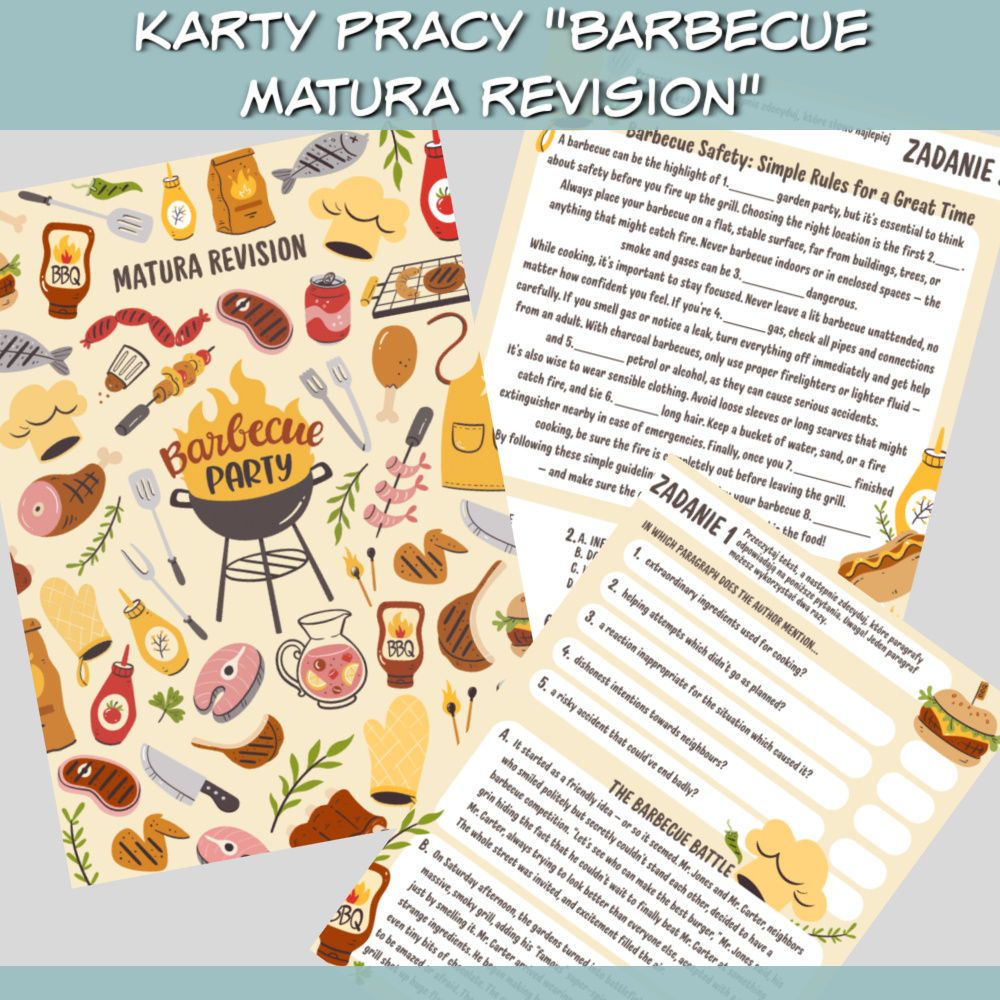Karty pracy Barbecue Matura Revision to zestaw w formacie PDF, stworzony z myślą o uczniach przygotowujących się do matury podstawowej z języka angielskiego. Tematyka grillowania i letnich spotkań sprawia, że zadania są angażujące i pełne humoru, a jednocześnie rozwijają wszystkie niezbędne umiejętności egzaminacyjne.