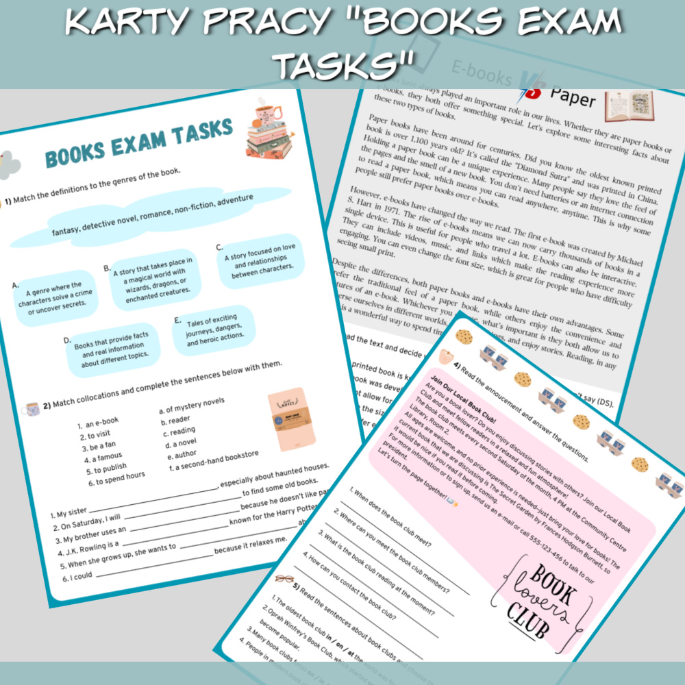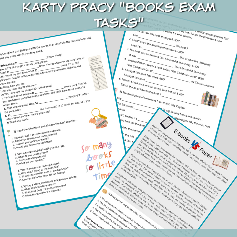 Karty pracy Books Exam Tasks to praktyczny zestaw edukacyjny stworzony z myślą o uczniach na poziomie A2/A2+ oraz o osobach przygotowujących się do egzaminu ósmoklasisty. Temat książek i czytania stanowi świetne tło do utrwalania słownictwa, gramatyki i umiejętności egzaminacyjnych w ciekawy sposób.