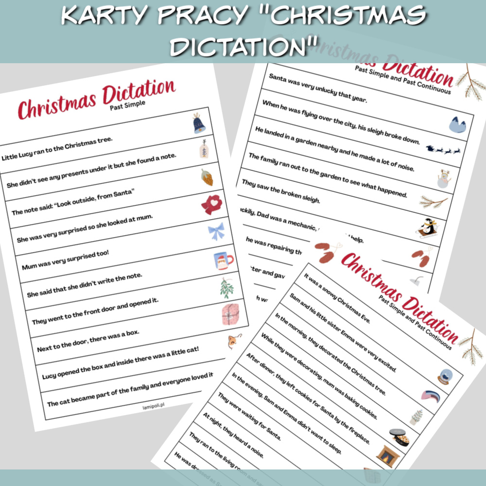 Zestaw Christmas Dictation jest odpowiedni dla uczniów starszych klas szkoły podstawowej. Wykorzystanie struktury gramatyczne to czasy: Present Simple, Past Simple oraz Past Continuous. Na górze każdej strony znajdziesz informację, których czasów dotyczą ćwiczenia.