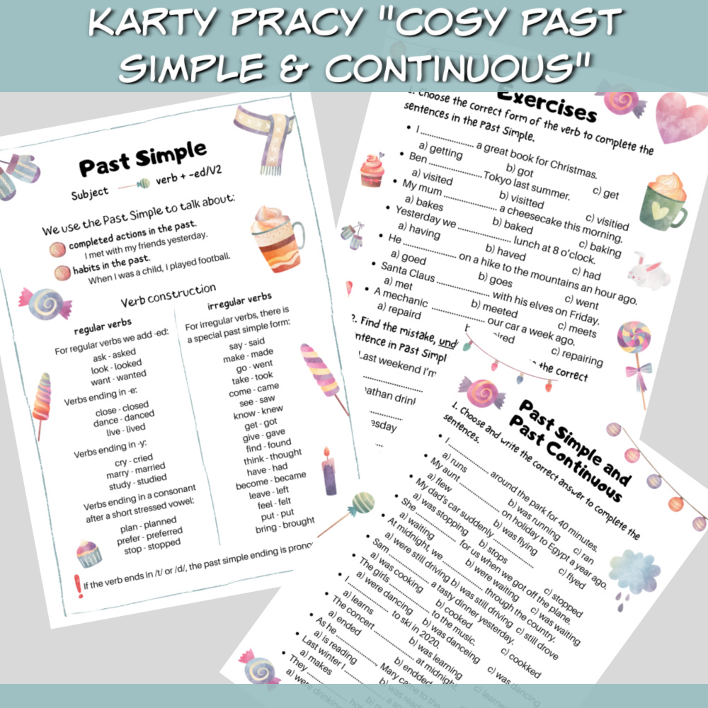 Karty pracy Cosy Past Simple & Continuous to zestaw na zajęcia z języka angielskiego z młodzieżą i dorosłymi. W zestawie znajdziemy teorię oraz zadania, które pomogą uczniom przećwiczyć użycie czasów Past Simple oraz Past Continuous.