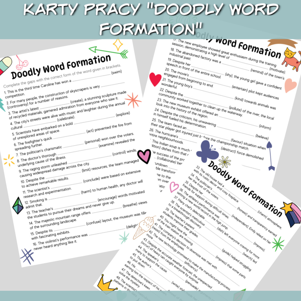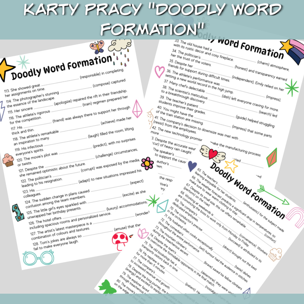 Karty pracy Doodly Word Formation to zestaw na zajęcia z języka angielskiego dla uczniów chcących przećwiczyć słowotwórstwo. Zestaw sprawdzi się na zajęciach z młodzieżą i dorosłymi.