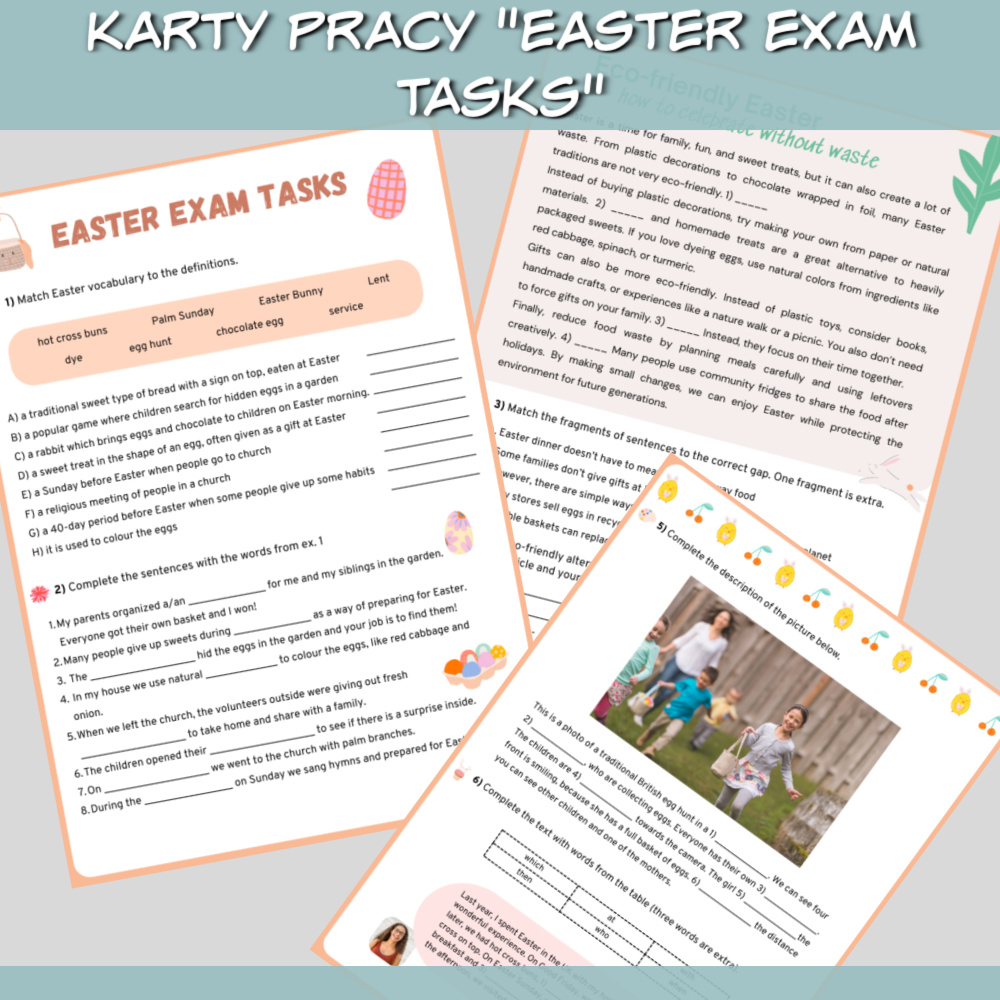 Karty pracy Easter Exam Tasks to świąteczny zestaw PDF stworzony z myślą o uczniach przygotowujących się do egzaminu ósmoklasisty z języka angielskiego. Materiał łączy wielkanocną tematykę z ćwiczeniami egzaminacyjnymi, dzięki czemu uczniowie mogą jednocześnie utrwalać słownictwo i struktury gramatyczne oraz wprowadzić trochę świątecznego klimatu do nauki.