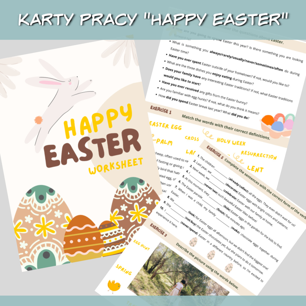 Karty pracy Happy Easter to wielkanocny zestaw ćwiczeń językowych w formacie PDF, idealny na zajęcia z uczniami na poziomie A2/A2+. Materiał łączy wielkanocną tematykę z różnorodnymi zadaniami rozwijającymi słownictwo, gramatykę i umiejętności komunikacyjne – zgodnie z wymaganiami egzaminacyjnymi.