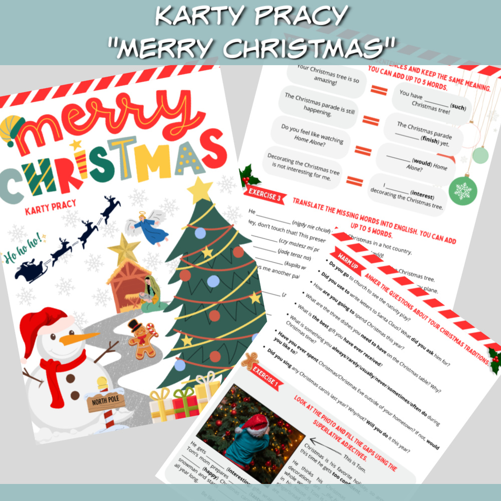 Karty pracy Merry Christmas to gotowe materiały na lekcję grupową lub zajęcia indywidualne. Wystarczy, że wydrukujesz karty i rozdasz je uczniom. Zadania z kart pracy dobraliśmy tak, by sprawdzały różnorodne umiejętności: spontaniczne wypowiedzi i znajomość struktur gramatycznych, a jednocześnie były utrzymane w radosnym, świątecznym klimacie. To idealny wybór na grudniową lekcję angielskiego!