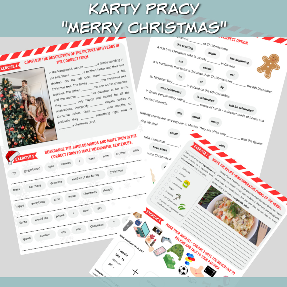 Zestaw kart pracy Merry Christmas składa się z 7 stron, w tym 5 z zadaniami i klucza odpowiedzi. Wszystkie zadania związane są z Bożym Narodzeniem i świątecznymi tradycjami, takimi jak ubieranie choinki czy wręczanie prezentów.