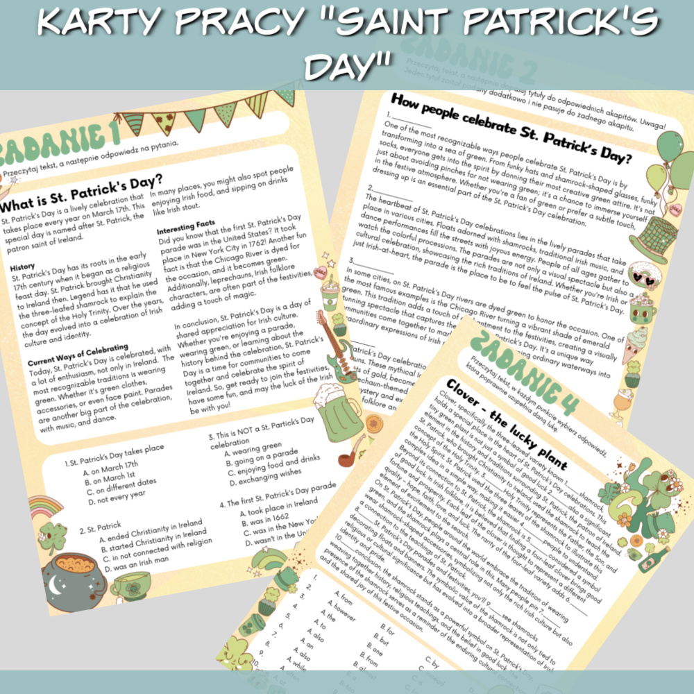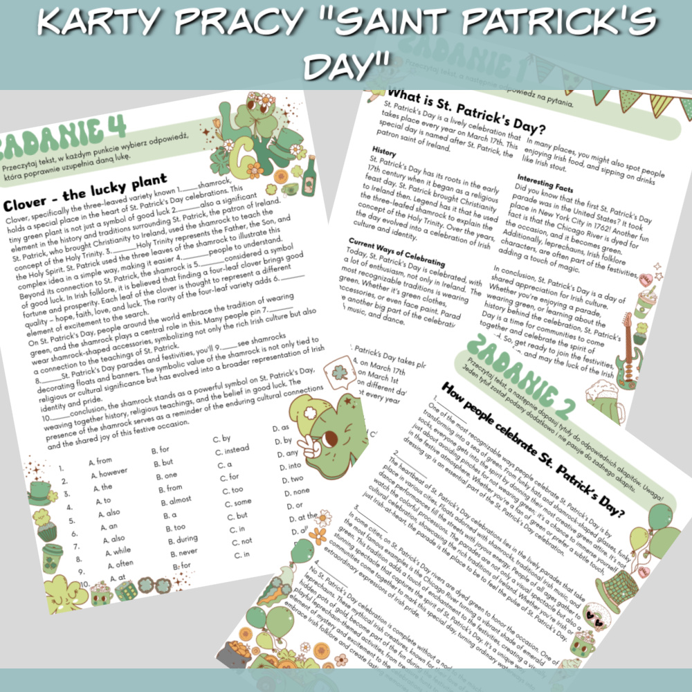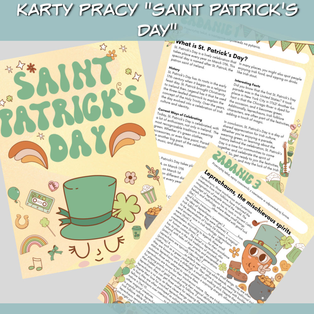Karty pracy Saint Patrick’s Day to zestaw na zajęcia z języka angielskiego dla uczniów od 7 klasy wzwyż na temat Dnia Świętego Patryka. W zestawie znajdziemy czytanki i zadania sprawdzające znajomość słownictwa oraz gramatyki. Zestaw idealnie sprawdzi się jako urozmaicenie zajęć przygotowujących uczniów do egzaminu ósmoklasisty.