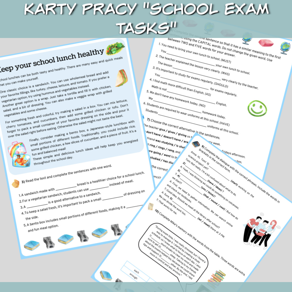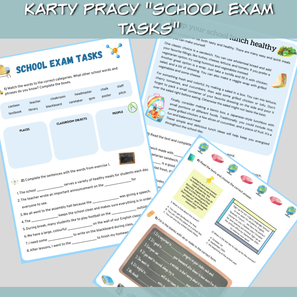 Karty pracy School Exam Tasks to zestaw na zajęcia z języka angielskiego, który idealnie sprawdzi się zarówno z uczniami przygotowującymi się do egzaminu ósmoklasisty, jak i z uczniami szkoły średniej. W zestawie School Exam Tasks znajdziemy czytanki, zadania sprawdzające znajomość słownictwa i zwrotów oraz zadania sprawdzające znajomość gramatyki. Wszystko w tematyce szkoły.