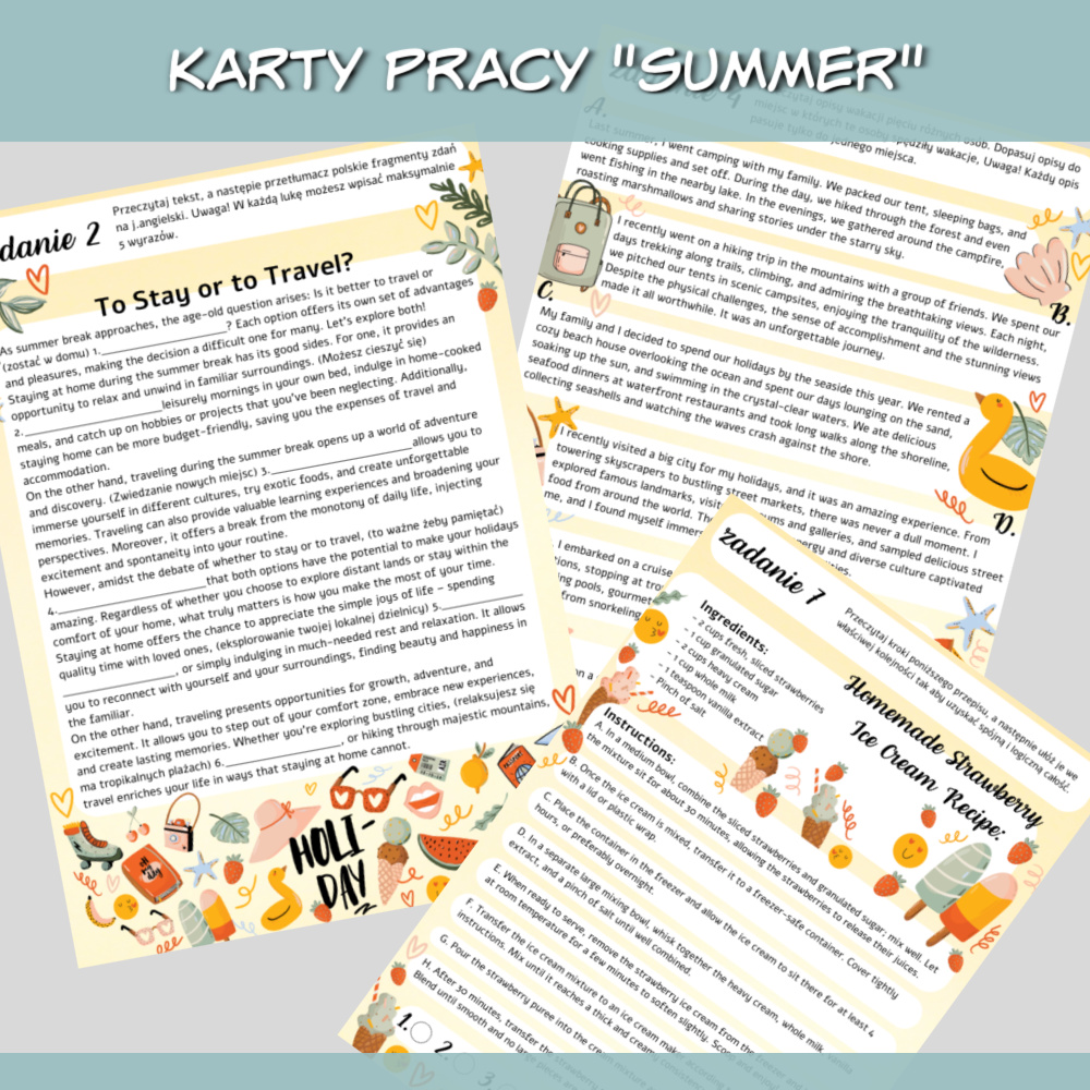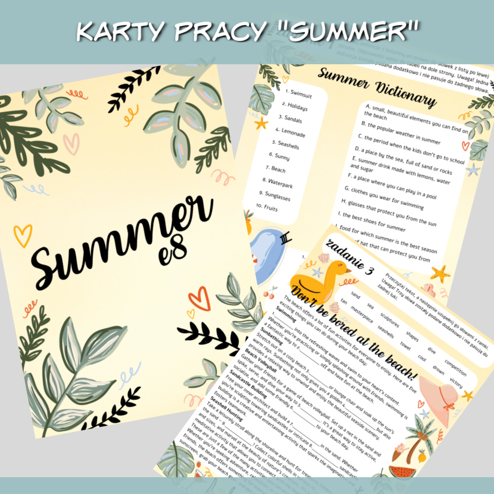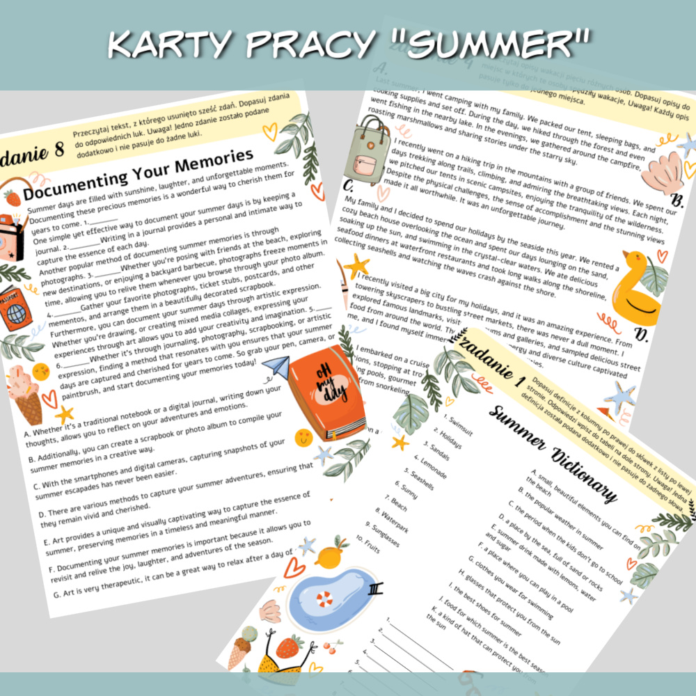 Karty pracy Summer do druku to zestaw na zajęcia z języka angielskiego dla uczniów od 8 klasy wzwyż na temat lata. W zestawie znajdziemy czytanki i zadania sprawdzające znajomość słownictwa oraz gramatyki. Karty pracy Summer idealnie sprawdzą się jako urozmaicenie zajęć przygotowujących uczniów do egzaminu ósmoklasisty oraz matury podstawowej.