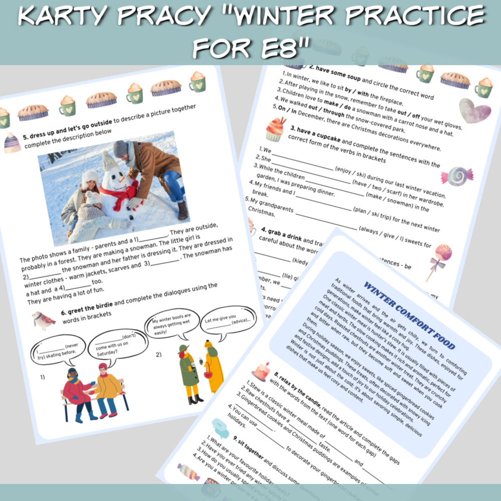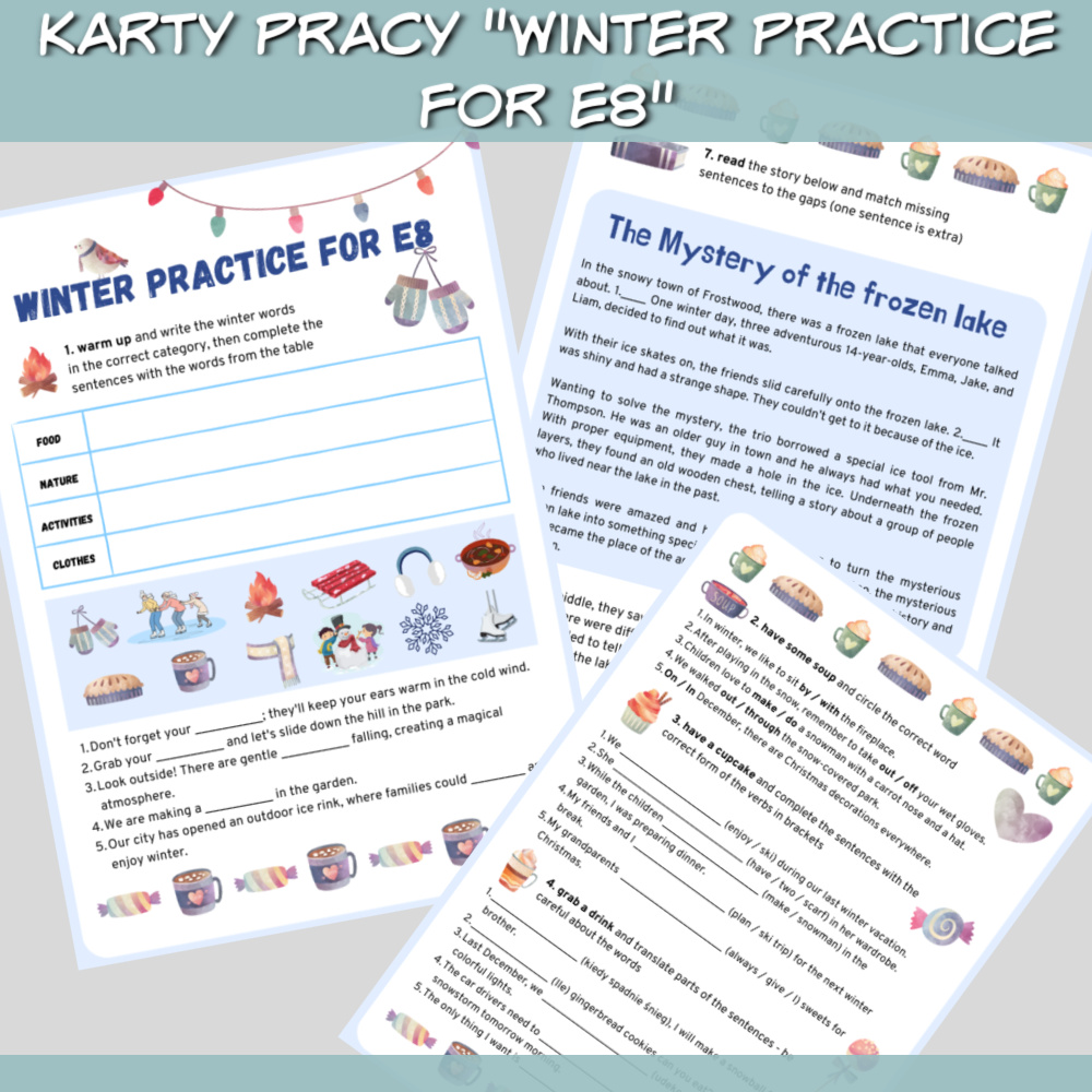 Karty pracy Winter practice for E8 to zimowy zestaw na zajęcia z języka angielskiego, który idealnie sprawdzi się zarówno z uczniami przygotowującymi się do egzaminu ósmoklasisty, jak i z uczniami szkoły średniej. W zestawie Winter practice for E8 znajdziemy czytanki, zadania sprawdzające znajomość słownictwa i zwrotów oraz zadania sprawdzające znajomość gramatyki.