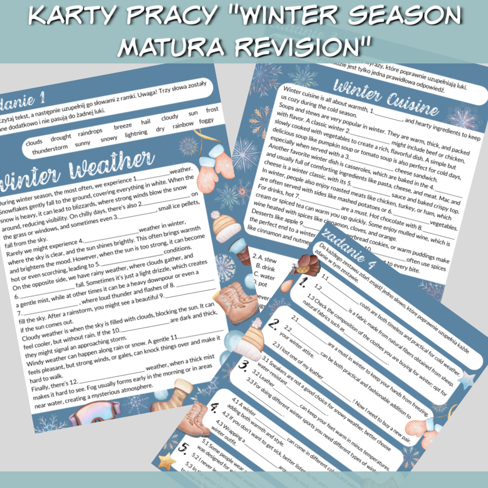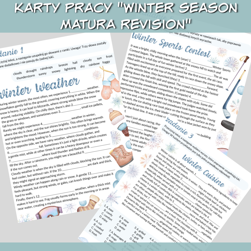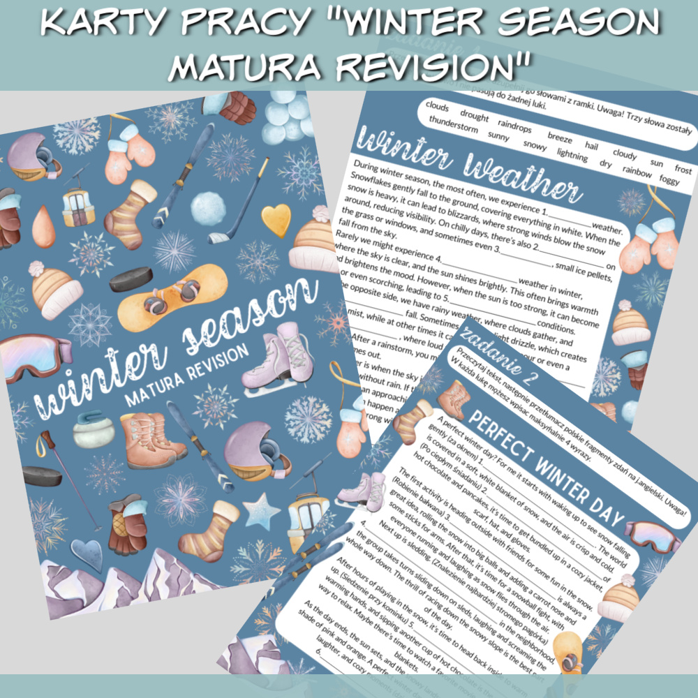 Karty pracy Winter Season Matura Revision to zestaw na zajęcia z języka angielskiego dla uczniów ze szkoły średniej. W zestawie znajdziemy pięć kart pracy z zadaniami w zimowym klimacie. Zestaw Karty pracy Winter Season Matura Revision idealnie sprawdzi się jako urozmaicenie zajęć przygotowujących uczniów do matury z języka angielskiego.