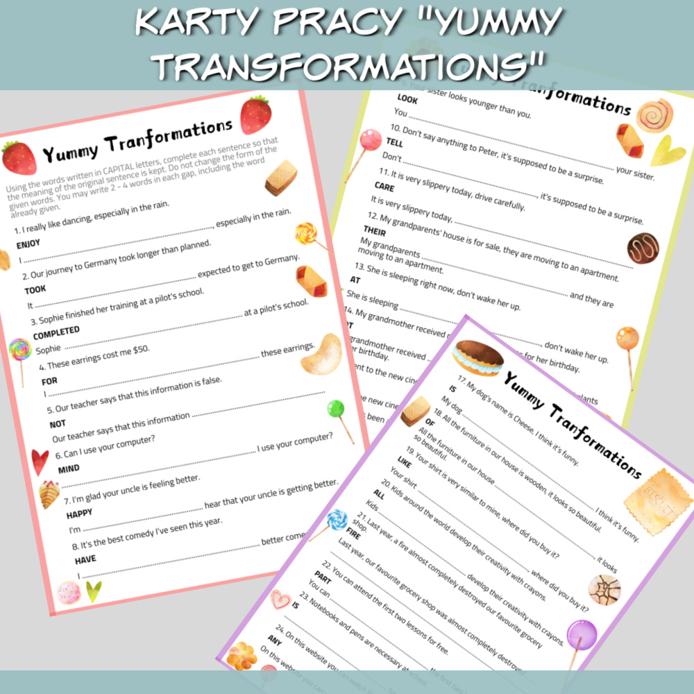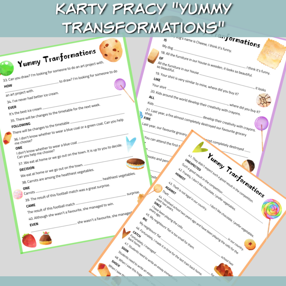 Karty pracy Yummy Transformations to zestaw na zajęcia z języka angielskiego dla uczniów chcących przećwiczyć transformacje ze słowem kluczem. Zestaw Karty pracy Yummy Transformations sprawdzi się na zajęciach z młodzieżą i dorosłymi, będzie też idealnym uzupełnieniem zajęć przygotowujących uczniów do egzaminu ósmoklasisty oraz matury.