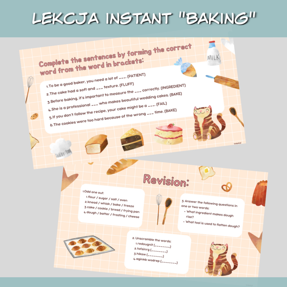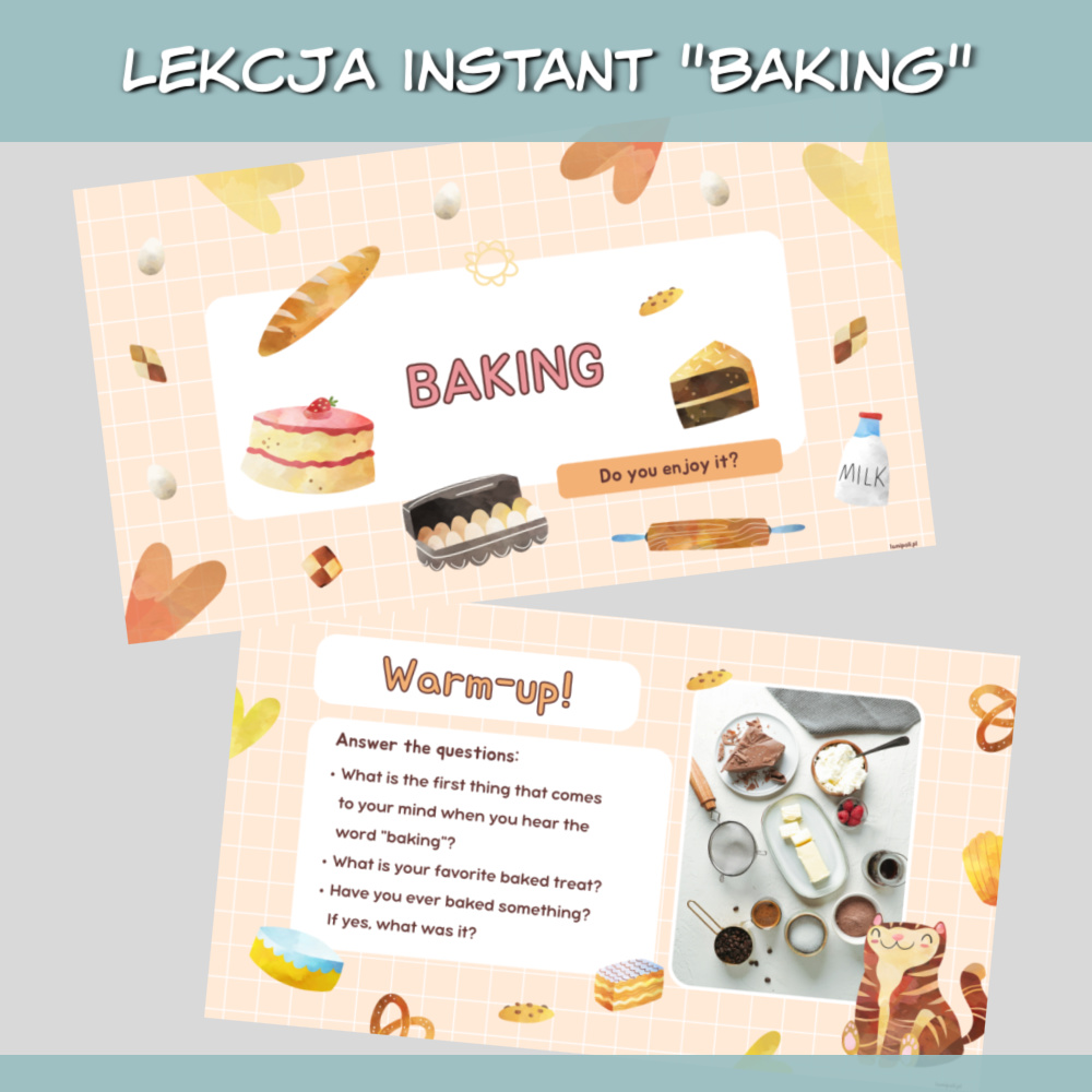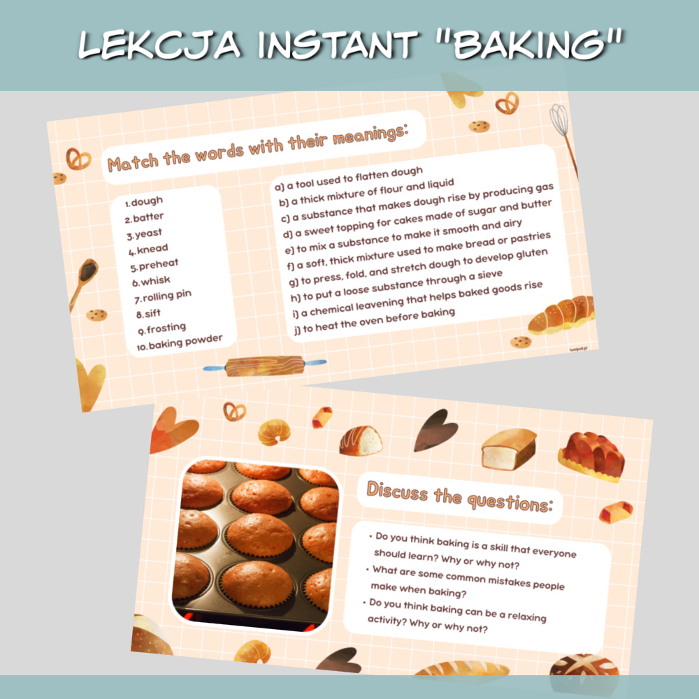 Lekcja Instant Baking to komplet interaktywnych materiałów do przeprowadzenia ciekawej lekcji języka angielskiego na poziomie B1. Temat pieczenia pozwala w naturalny sposób rozwijać słownictwo kulinarne, umiejętność mówienia i czytania ze zrozumieniem. Zestaw został opracowany z myślą o młodzieży i dorosłych, którzy uczą się języka angielskiego na poziomie średnio zaawansowanym.
