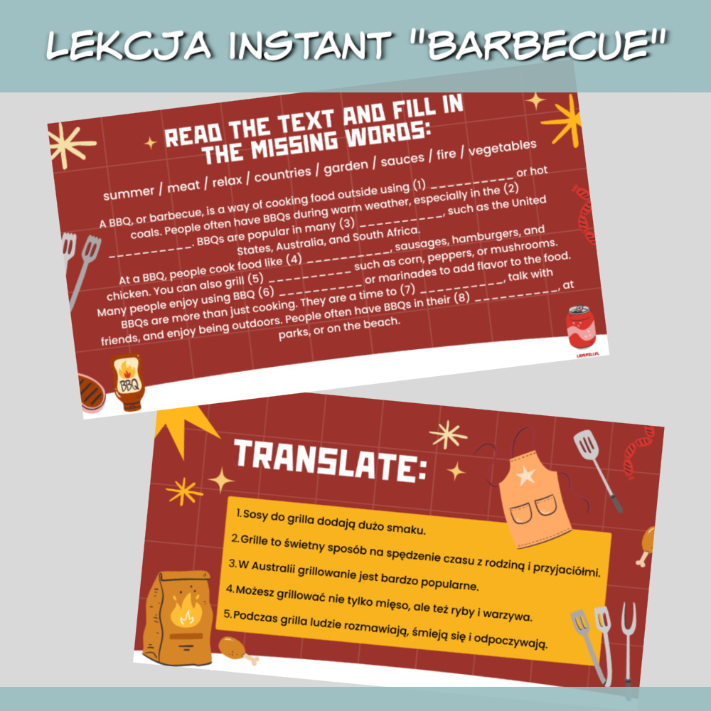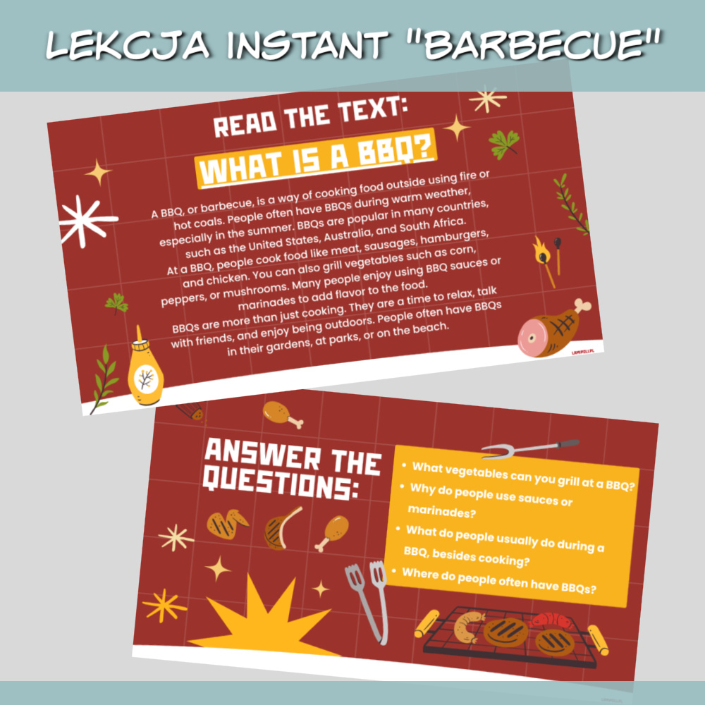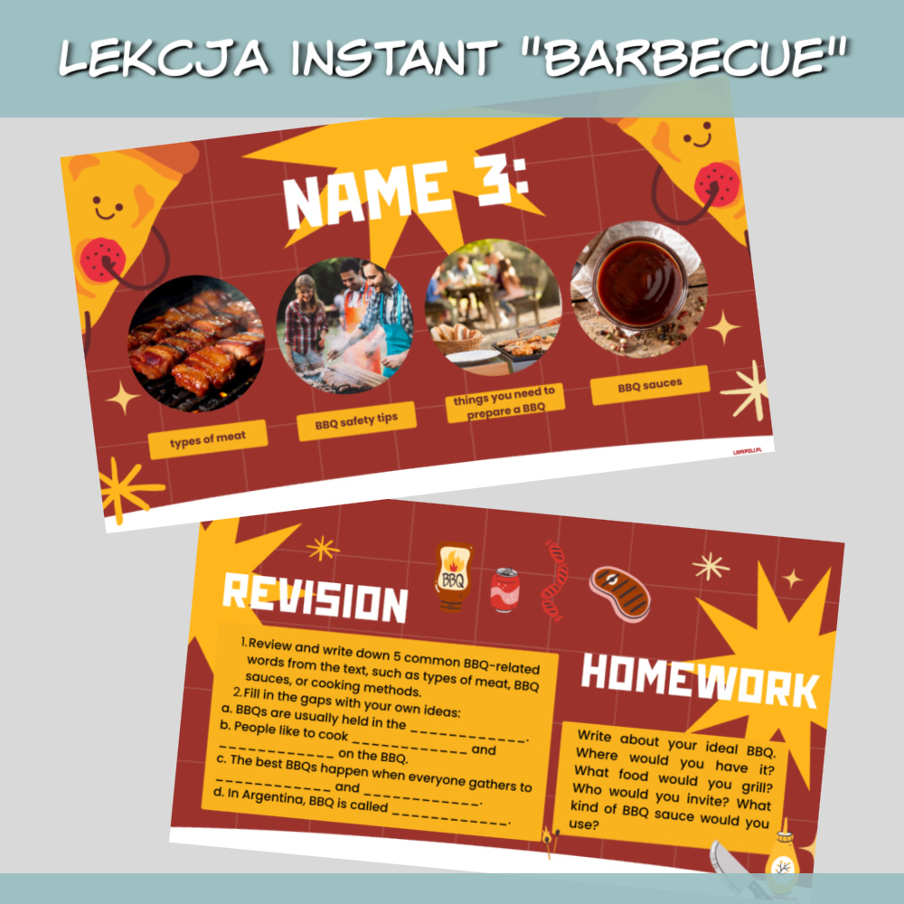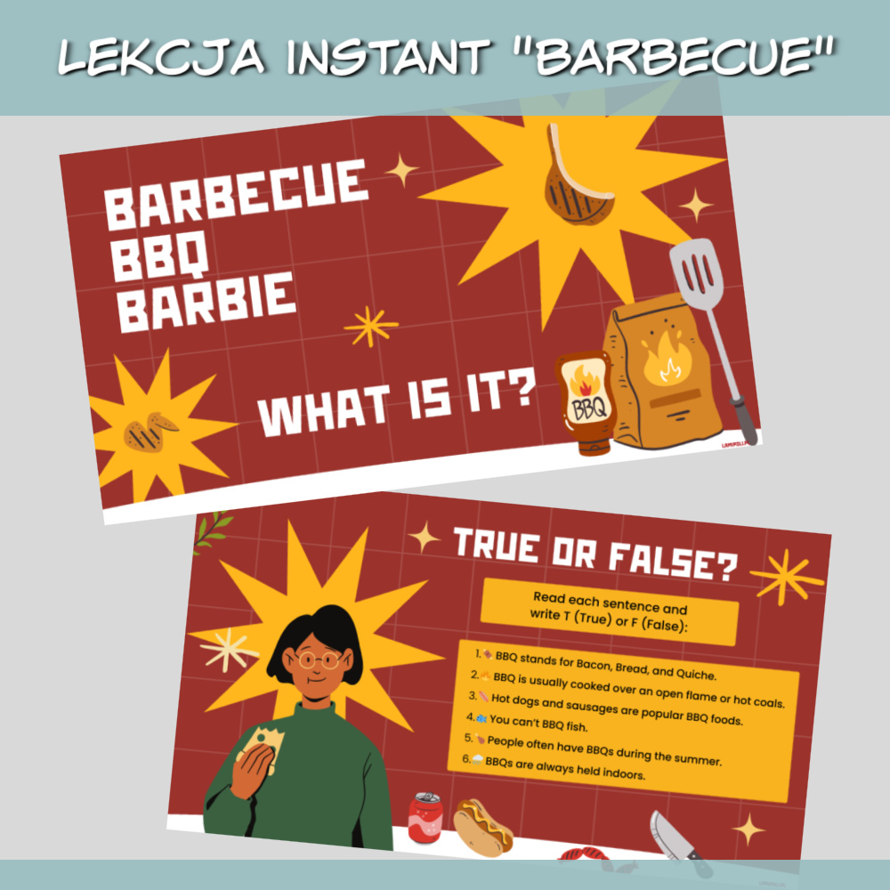 Lekcja Instant Barbecue to zestaw interaktywnych materiałów PDF do przeprowadzenia ciekawej i angażującej lekcji języka angielskiego na poziomie A2. Tematem przewodnim jest grillowanie, popularne i bliskie uczniom zagadnienie, które sprzyja rozmowie, nauce słownictwa oraz rozwijaniu praktycznych umiejętności językowych. Materiały sprawdzą się zarówno w pracy z młodzieżą, jak i dorosłymi.