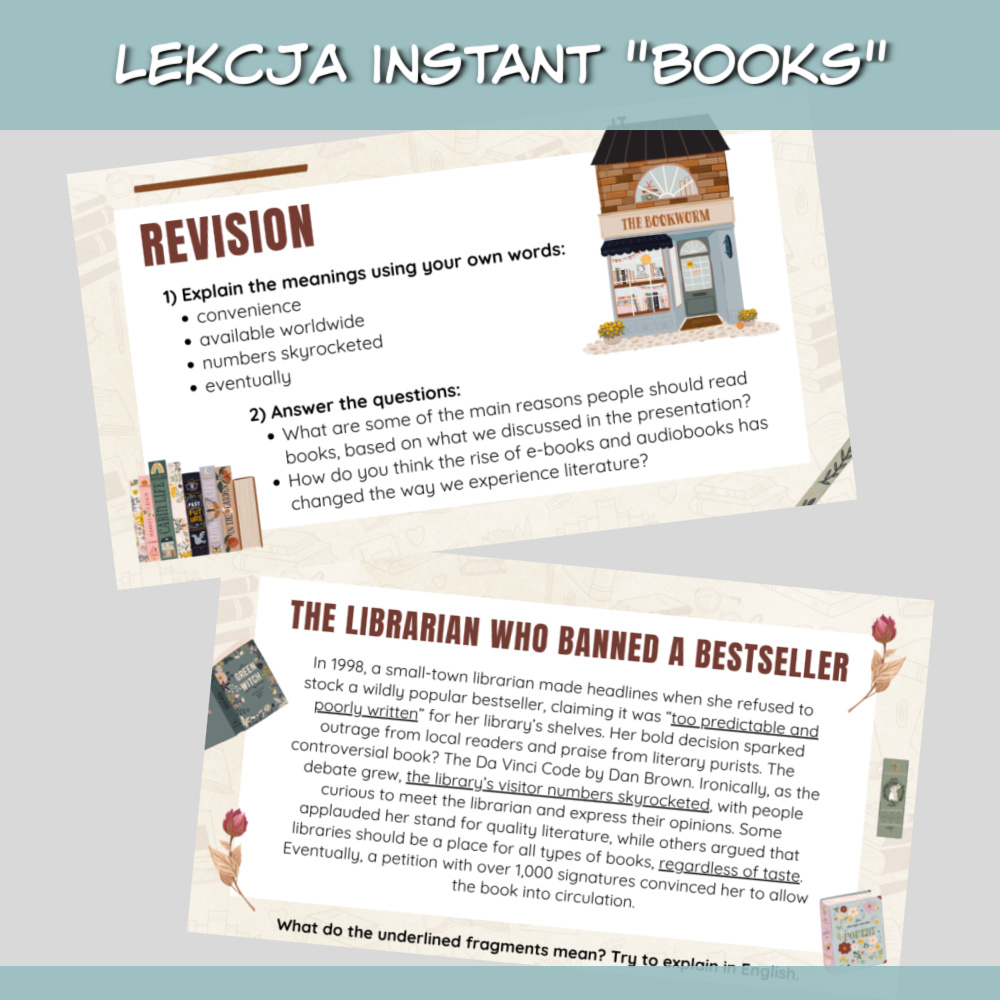 Lekcja Instant Books zanurz się w świat książek i czytelnictwa! Ten zestaw materiałów PDF pomoże Twoim uczniom rozwijać słownictwo, umiejętność wypowiadania się i czytania ze zrozumieniem, opierając się na temacie, który budzi emocje i prowokuje do dyskusji – książki i literatura.