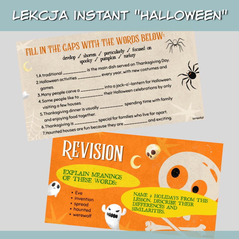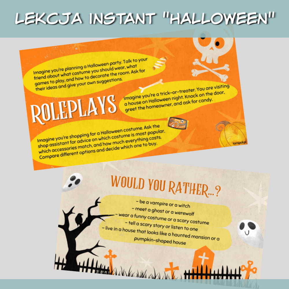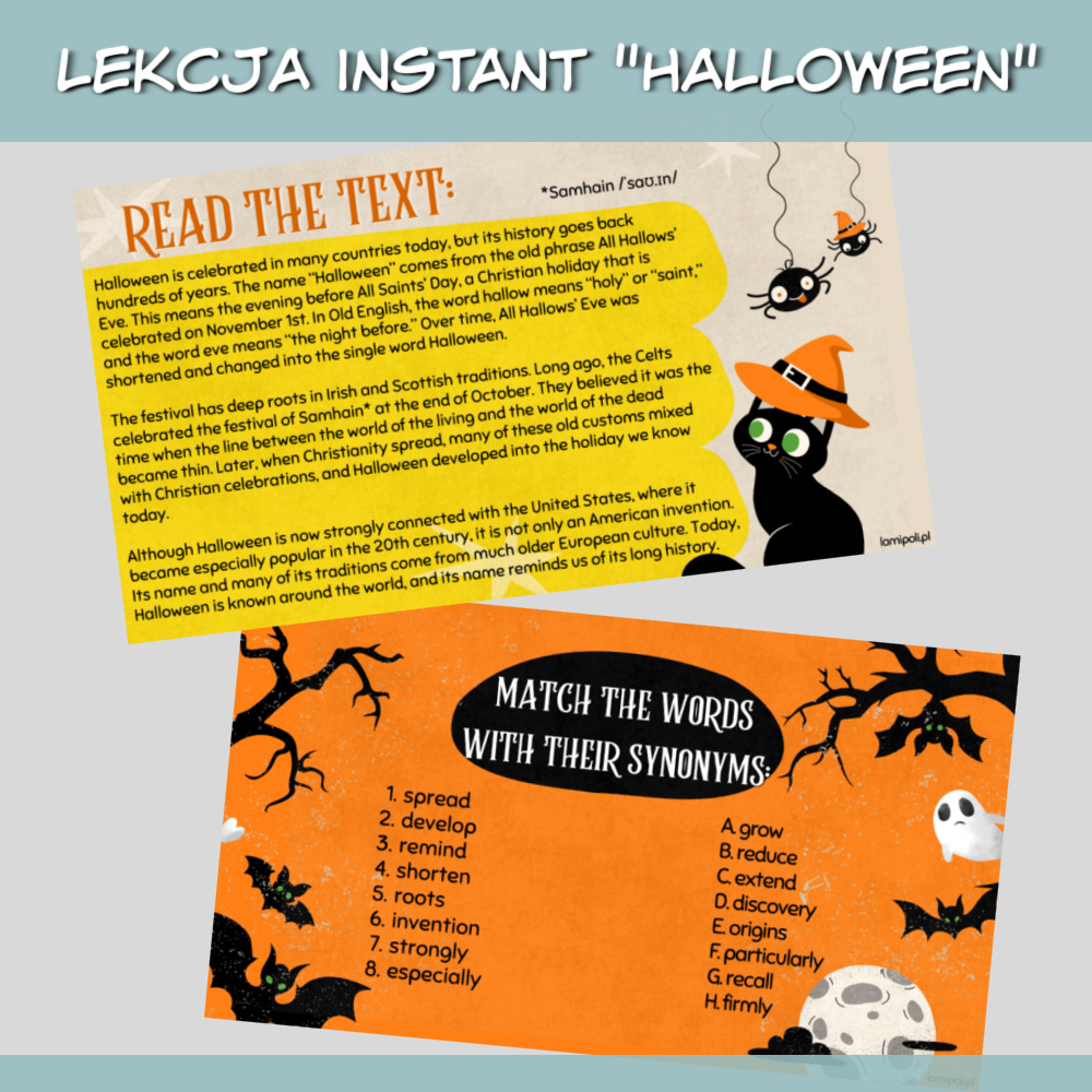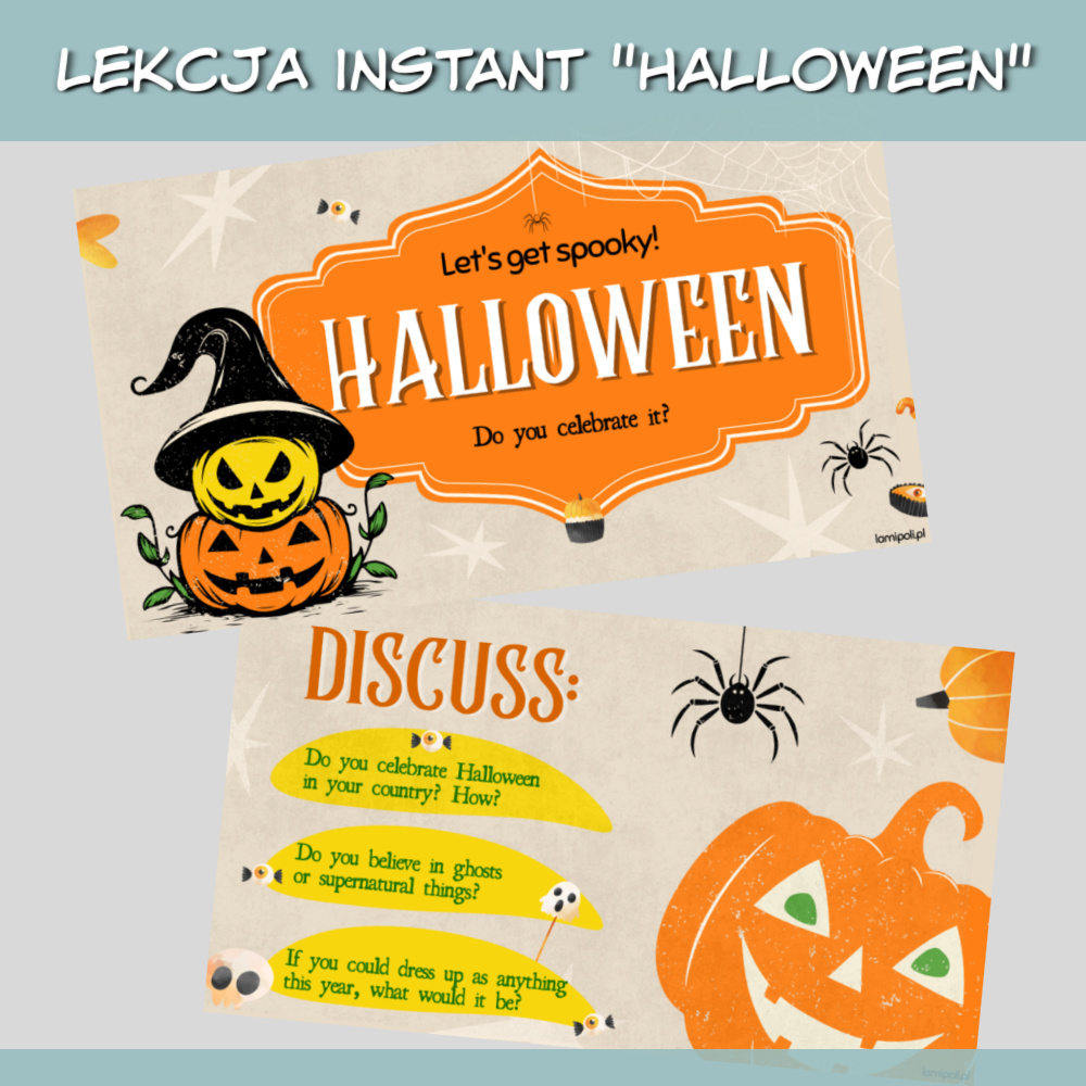 Lekcja Instant Halloween to gotowy zestaw materiałów PDF do przeprowadzenia angażującej lekcji języka angielskiego na poziomie B1–B2. Motywem przewodnim jest Halloween – jego historia, tradycje i współczesne zwyczaje. Temat święta stanowi doskonały punkt wyjścia do rozmów o kulturze, zwyczajach i językowych ciekawostkach.