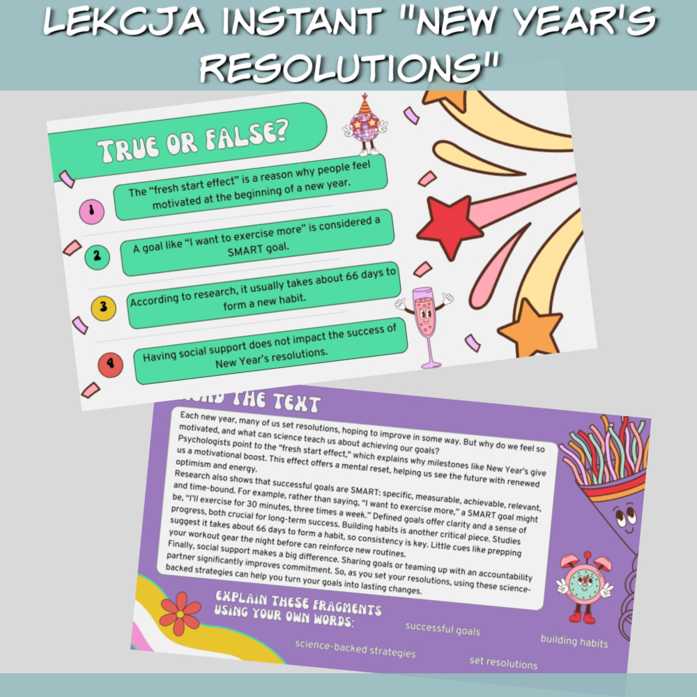 Zestaw Lekcja Instant New Year’s Resolutions to gotowe materiały na całą lekcję angielskiego. Od prostego speakingu na start, przez czytanie ze zrozumieniem, aż po rozbudowane i porywające dyskusje. Wybierz Lekcję Instant New Year’s Resolutions, aby styczniowe zajęcia zmotywowały uczniów do wytężonej pracy, by osiągali swoje językowe cele!Skorzystaj z gotowej lekcji, by oszczędzić swój czas. Nie musisz drukować kart pracy. Wystarczy, że wyświetlisz prezentację na ekranie.