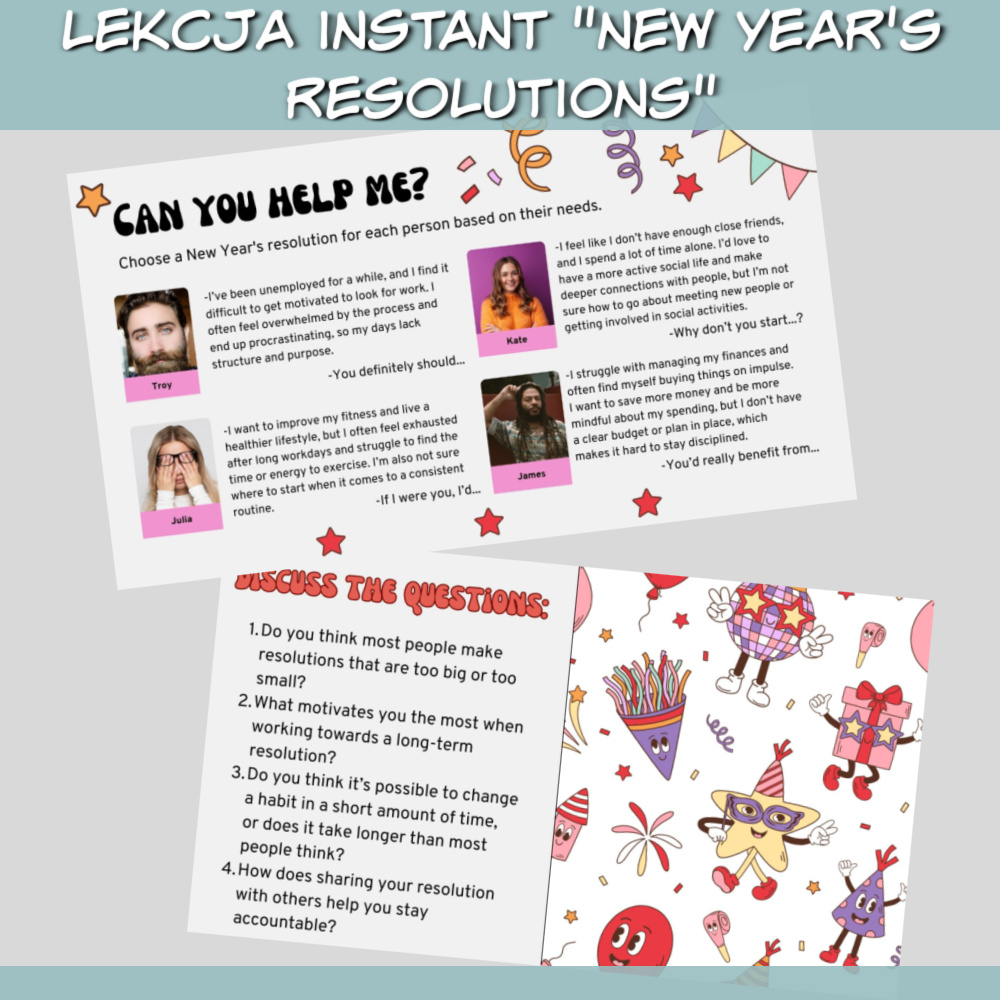 Co jest w zestawie na lekcję angielskiego o postanowieniach noworocznych?
