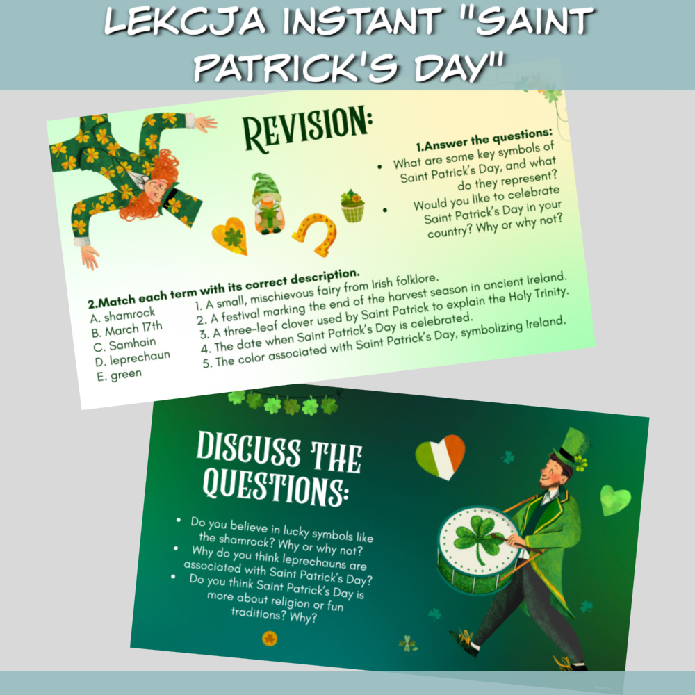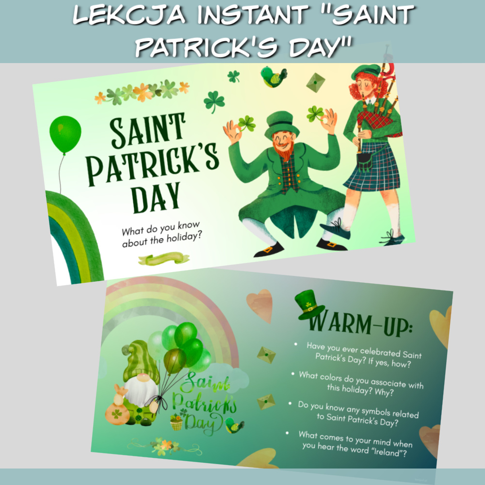 Lekcja Instant Saint Patrick’s Day to kompletny zestaw materiałów do przeprowadzenia angażującej lekcji języka angielskiego. Dzięki gotowej prezentacji wypełnisz całe zajęcia, wprowadzając uczniów w świat irlandzkich tradycji i symboliki związanej z Dniem Świętego Patryka. Idealna dla młodzieży i dorosłych na poziomie A2/B1.