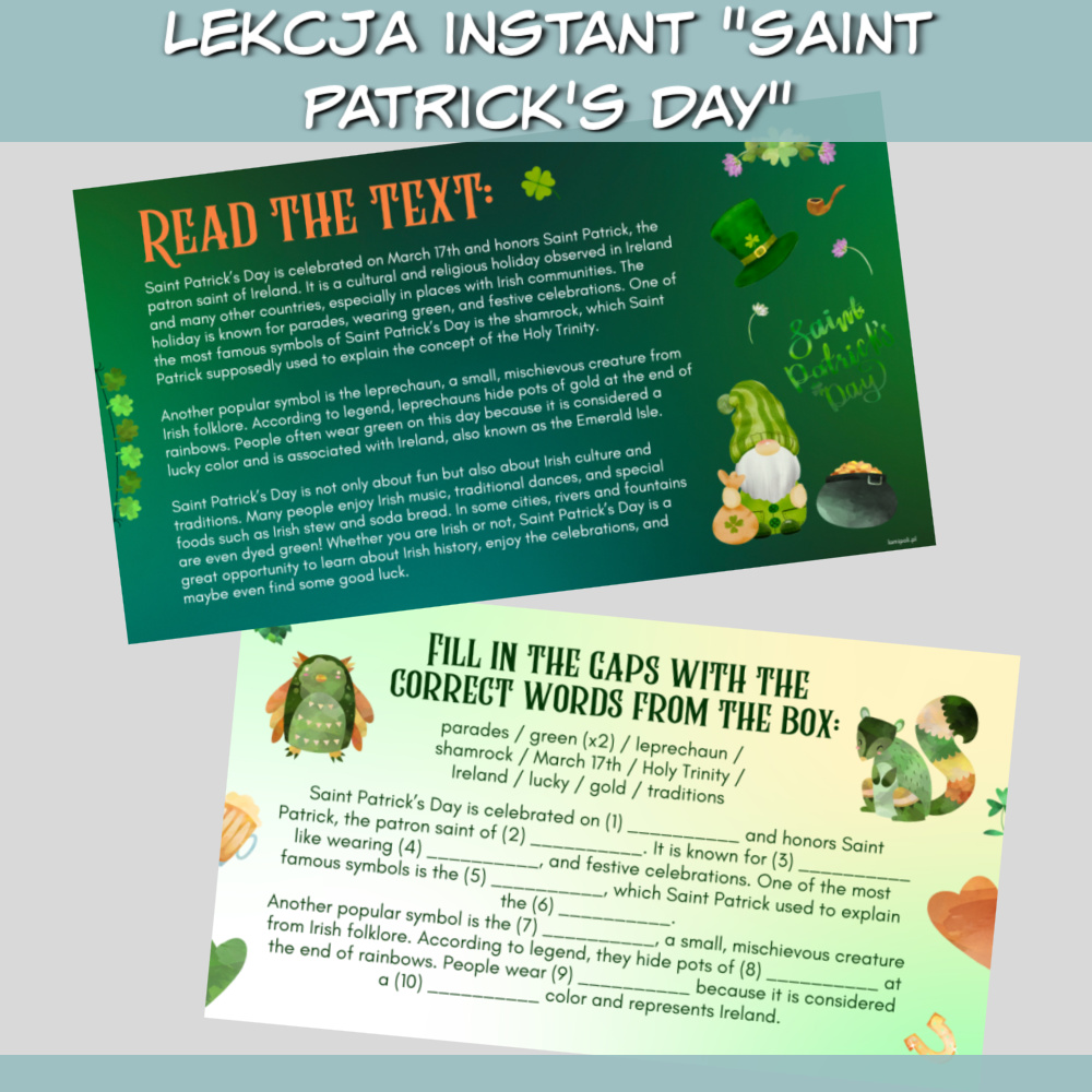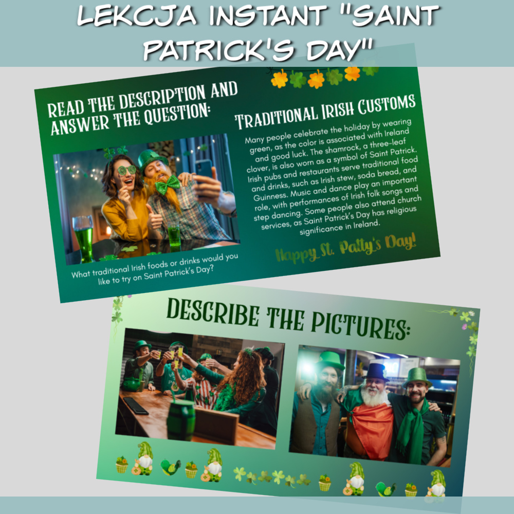 Lekcja Instant Saint Patrick’s Day to doskonały sposób na urozmaicenie zajęć i przybliżenie uczniom irlandzkiej kultury. Interaktywne zadania, interesujące teksty i angażujące pytania sprawią, że uczniowie będą z entuzjazmem uczestniczyć w lekcji.