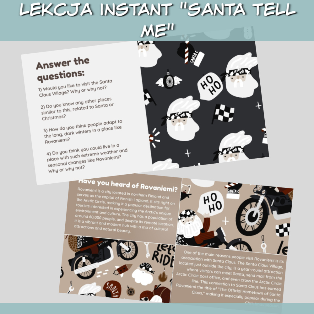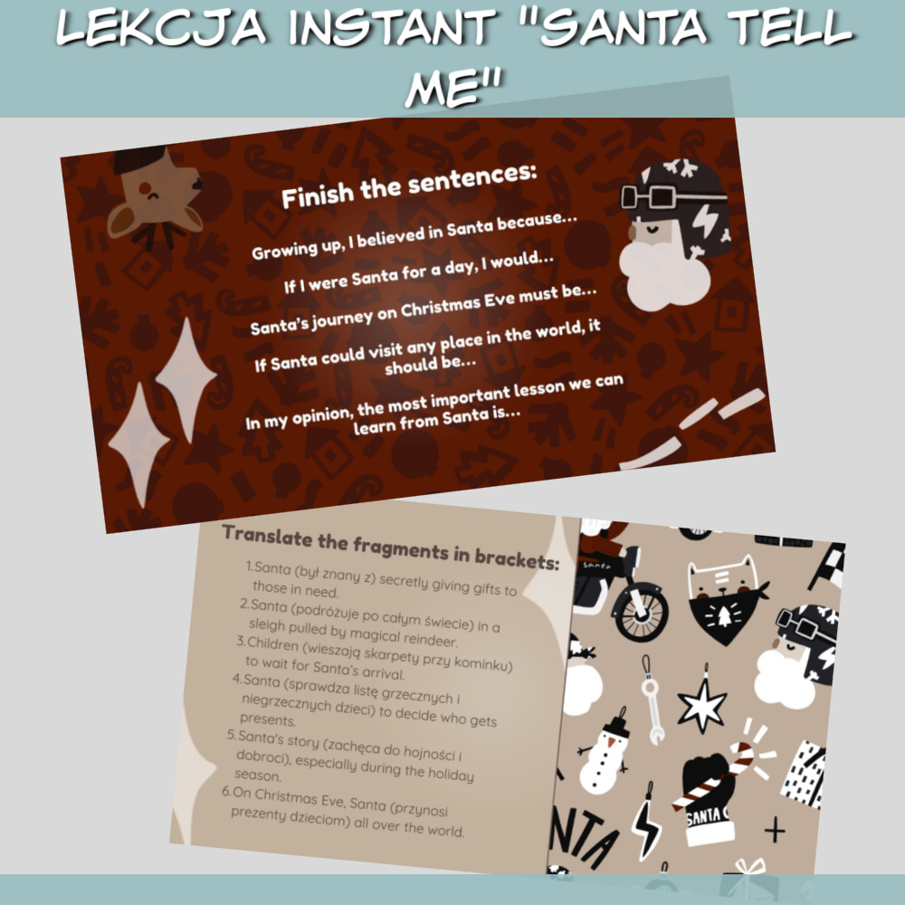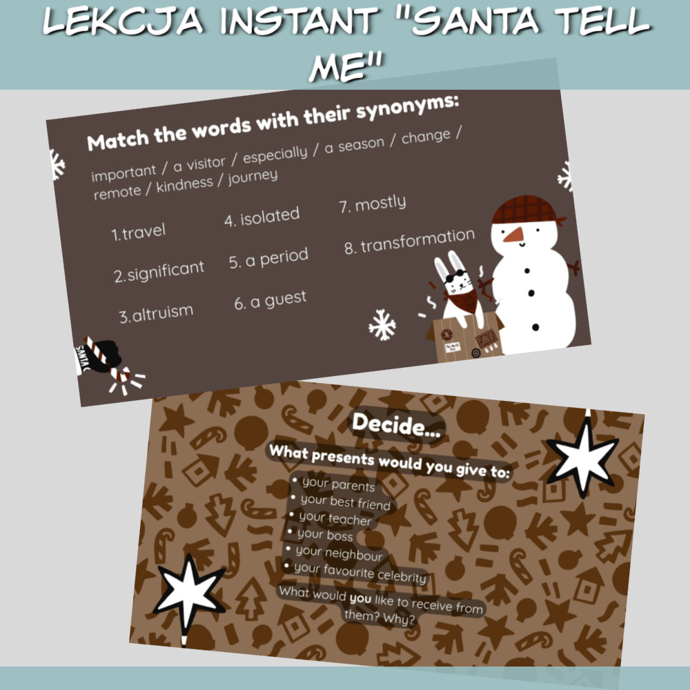 Lekcja Instant Santa Tell Me to świetny sposób na wprowadzenie bożonarodzeniowej atmosfery na zajęcia z języka angielskiego, a także na rozwijanie umiejętności językowych poprzez angażujące ćwiczenia. Czy Twoi uczniowie wierzą w Mikołaja? Niezależnie od odpowiedzi gotowa lekcja Instant Santa Tell Me zachwyci Twoich uczniów świątecznym klimatem i ciekawymi zadaniami.