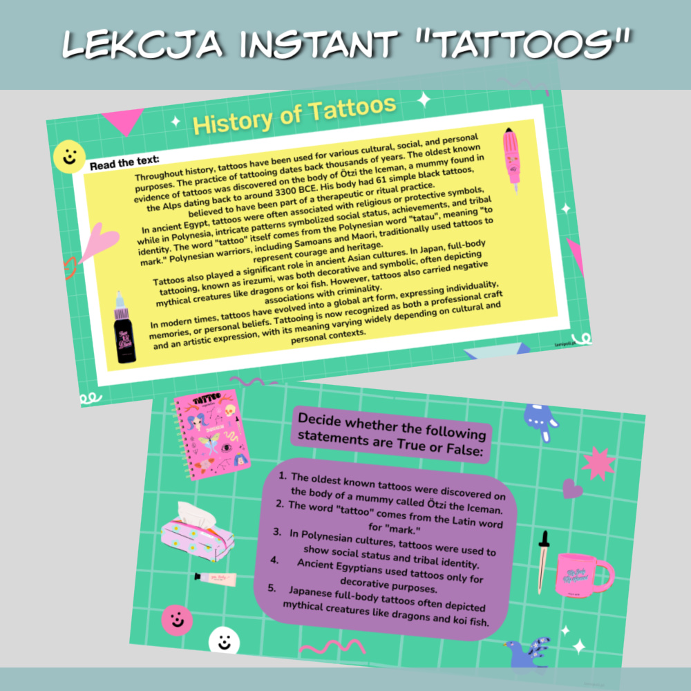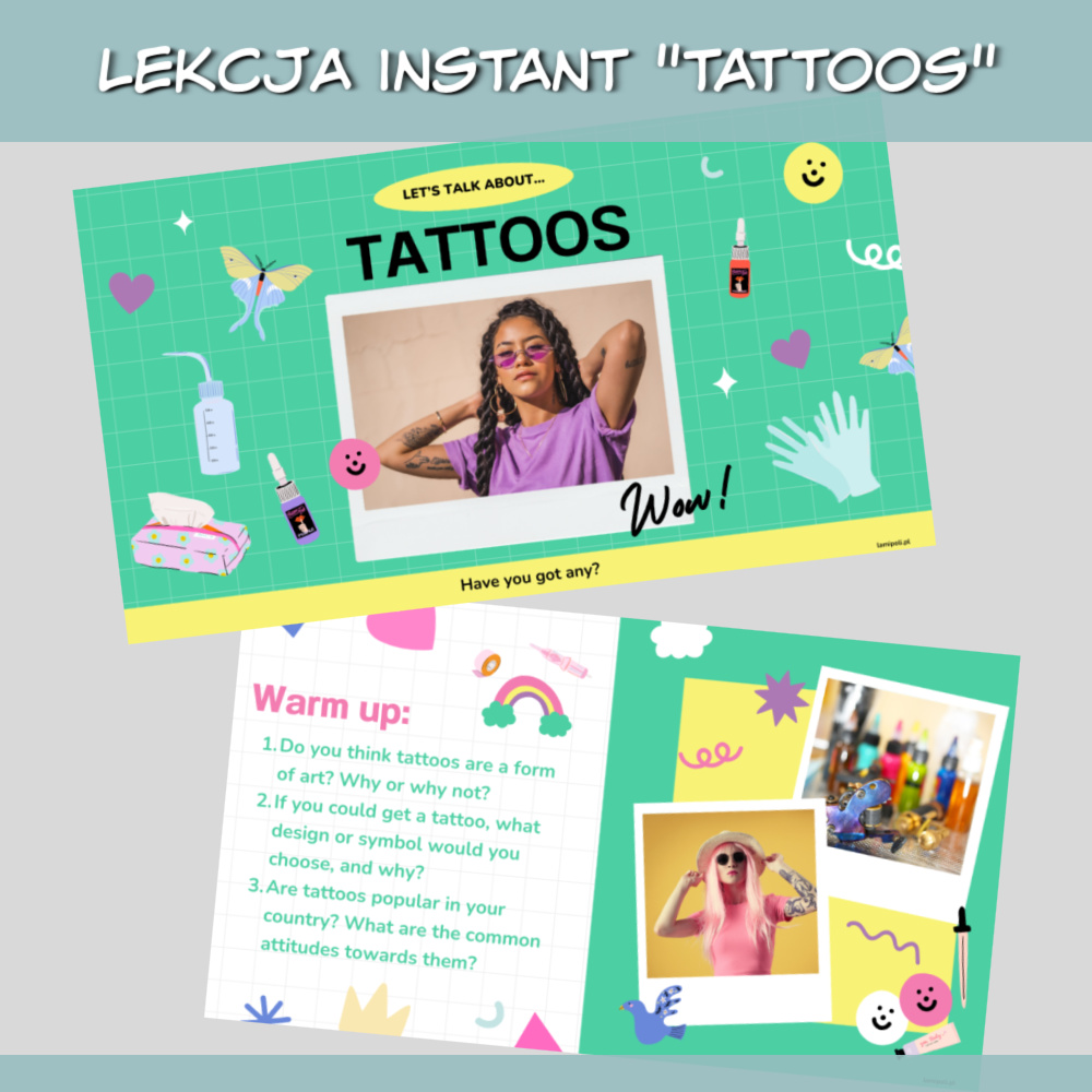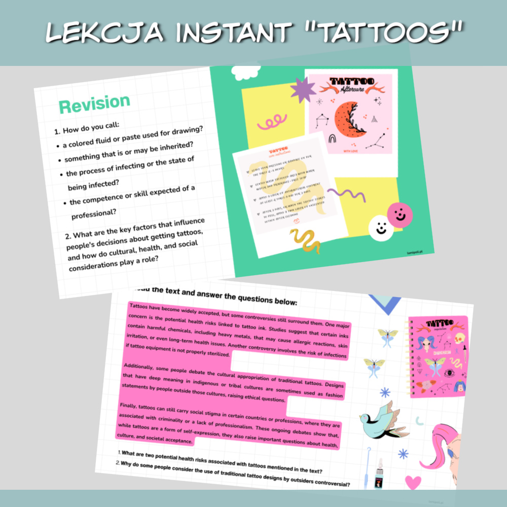 Lekcja Instant Tattoos to zestaw materiałów PDF do przeprowadzenia ciekawej lekcji języka angielskiego na poziomie B1. Temat tatuaży – aktualny i pełen kontrowersji – doskonale sprawdza się jako punkt wyjścia do angażujących rozmów, czytania ze zrozumieniem i rozwijania słownictwa. Zestaw stworzony został z myślą o młodzieży i dorosłych.