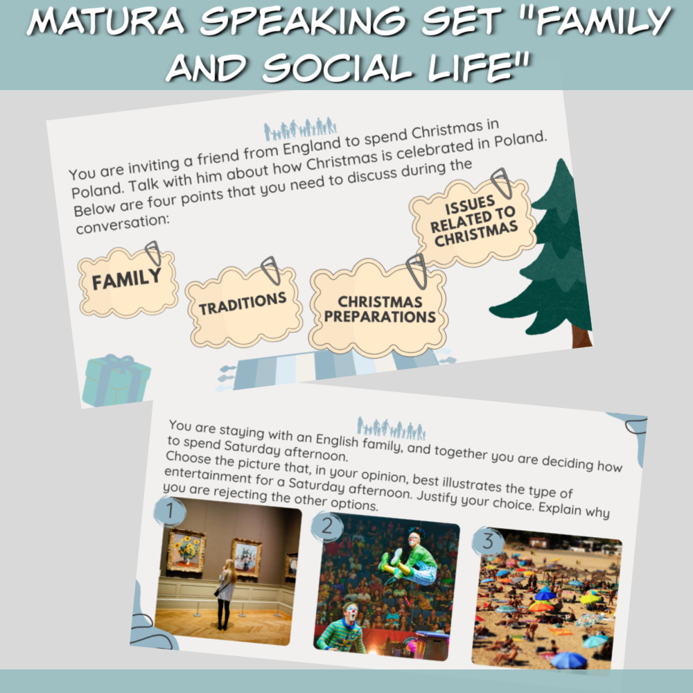 Matura speaking set Family and social life to zbiór zadań w formie prezentacji na zajęcia języka angielskiego z uczniami przygotowującymi się do matury oraz z dorosłymi. W zestawie Matura speaking set Family and social life znajdziemy zadania na speaking w temacie rodziny i życia społecznego.