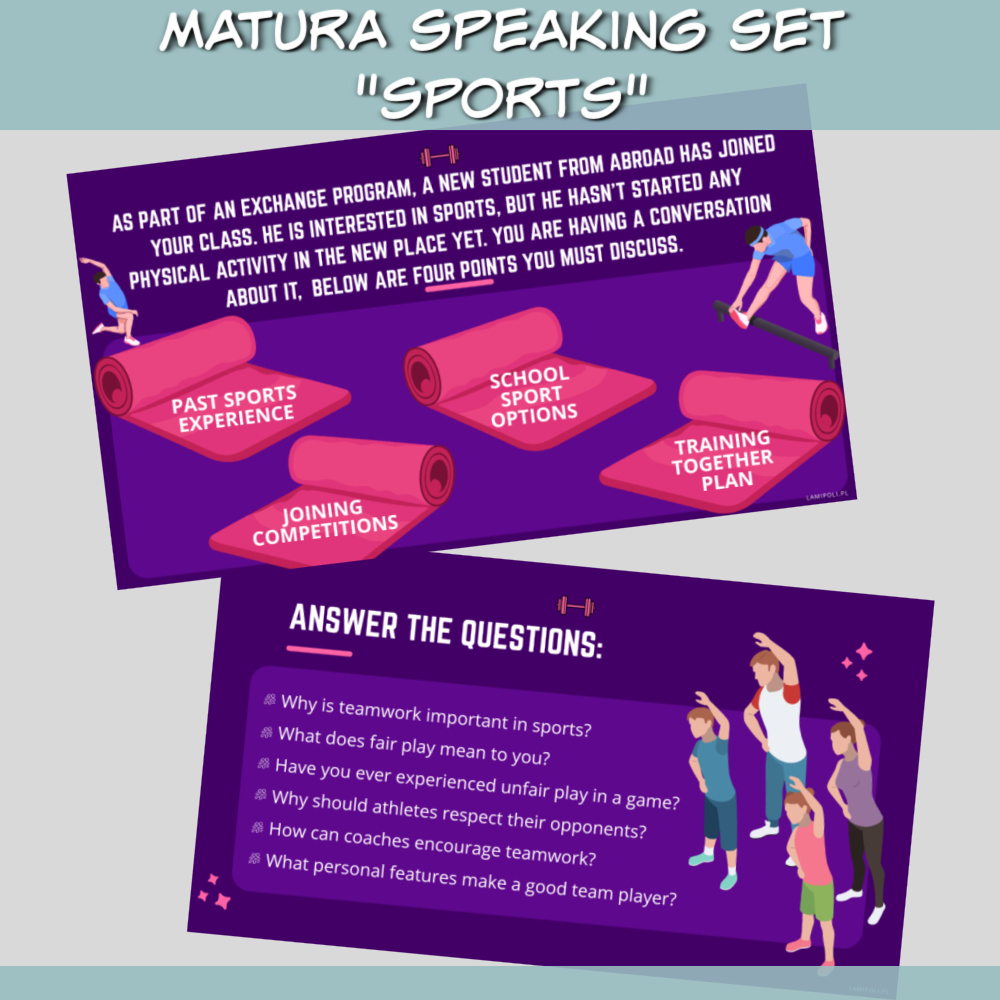 Matura Speaking Set Sports to gotowy do druku zestaw kart PDF, który pomoże Twoim uczniom skutecznie przygotować się do ustnej części egzaminu maturalnego z języka angielskiego. Zestaw koncentruje się na temacie sportu – bliskim i interesującym dla wielu uczniów – dzięki czemu ćwiczenia są angażujące, naturalne i zgodne z wymaganiami maturalnymi.