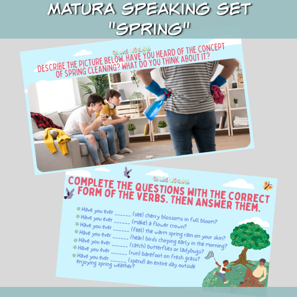 Matura Speaking Set Spring, czyli gotowe zadania na wiosenne lekcje angielskiego! Szukasz angażujących materiałów na lekcje języka angielskiego, które przygotują Twoich uczniów do matury? Matura Speaking Set Spring to idealny zestaw dla nauczycieli pracujących z młodzieżą maturalną i dorosłymi kursantami. Dzięki różnorodnym ćwiczeniom Twoi uczniowie będą mieli okazję rozwijać umiejętności mówienia, używając praktycznego języka.