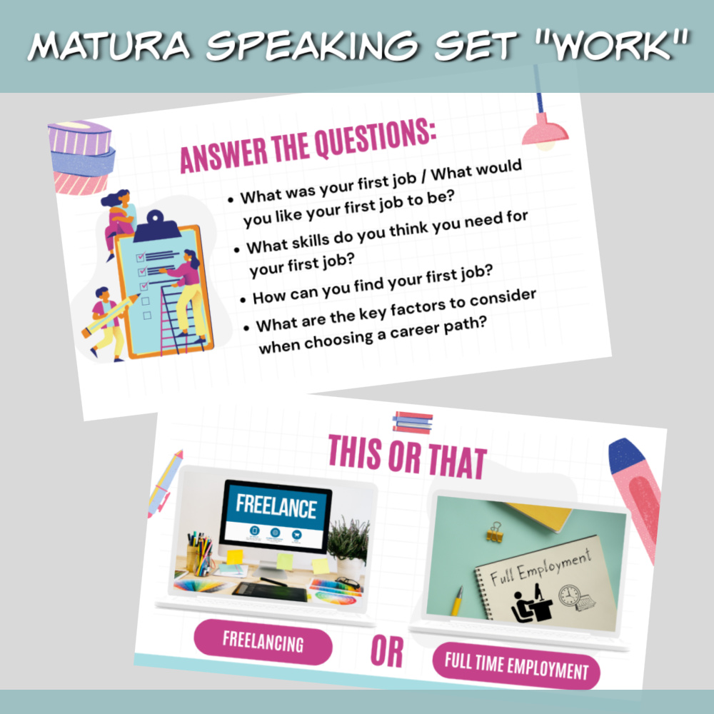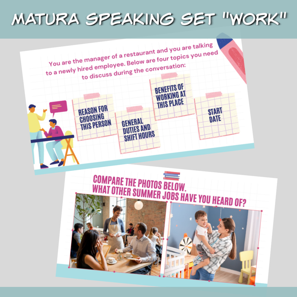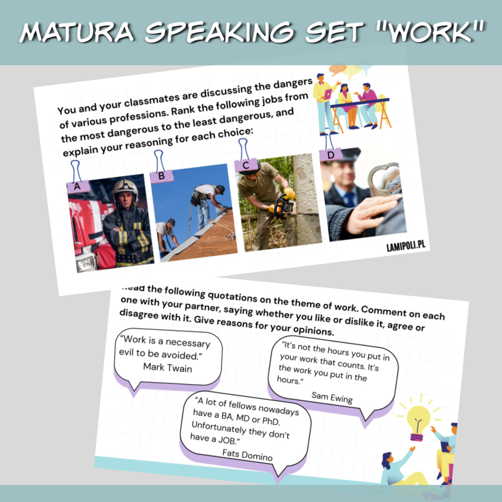 Matura speaking set Work to zbiór zadań w formie prezentacji na zajęcia języka angielskiego z uczniami przygotowującymi się do matury oraz z dorosłymi. W zestawie znajdziemy zadania na speaking w temacie pracy.