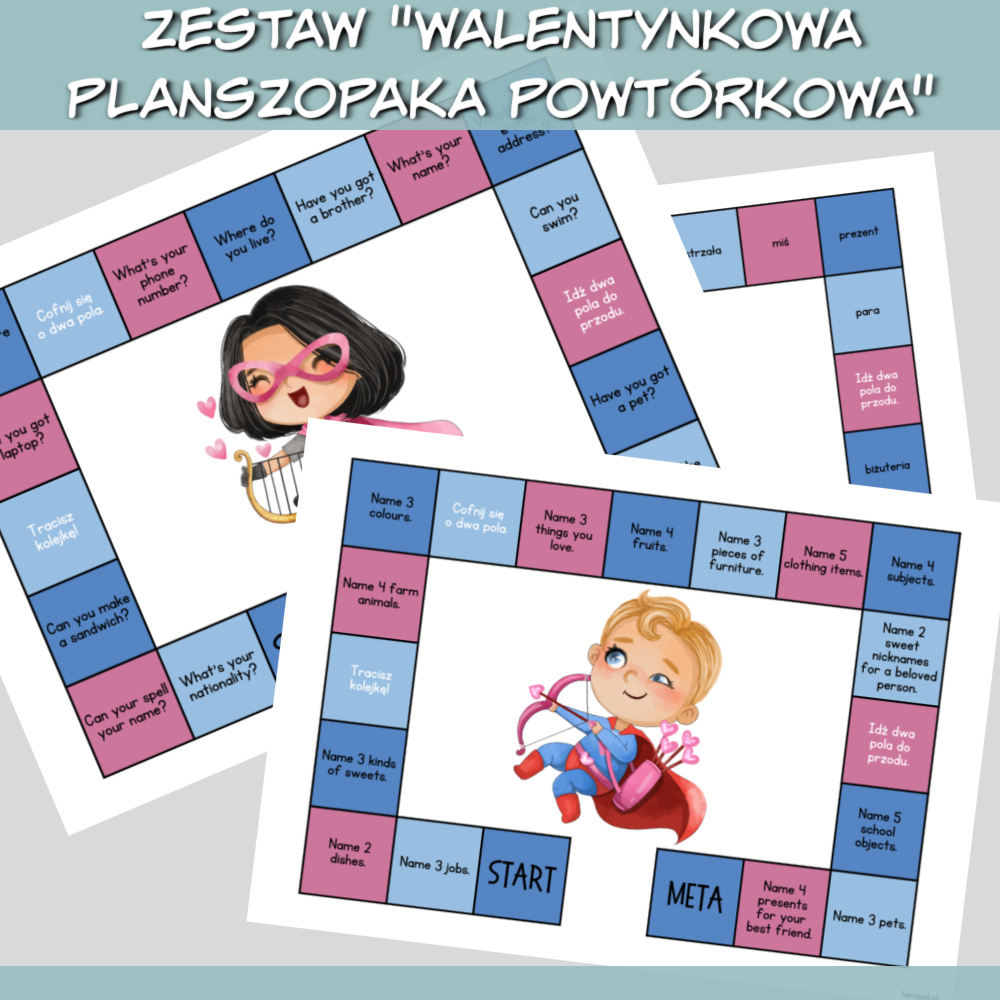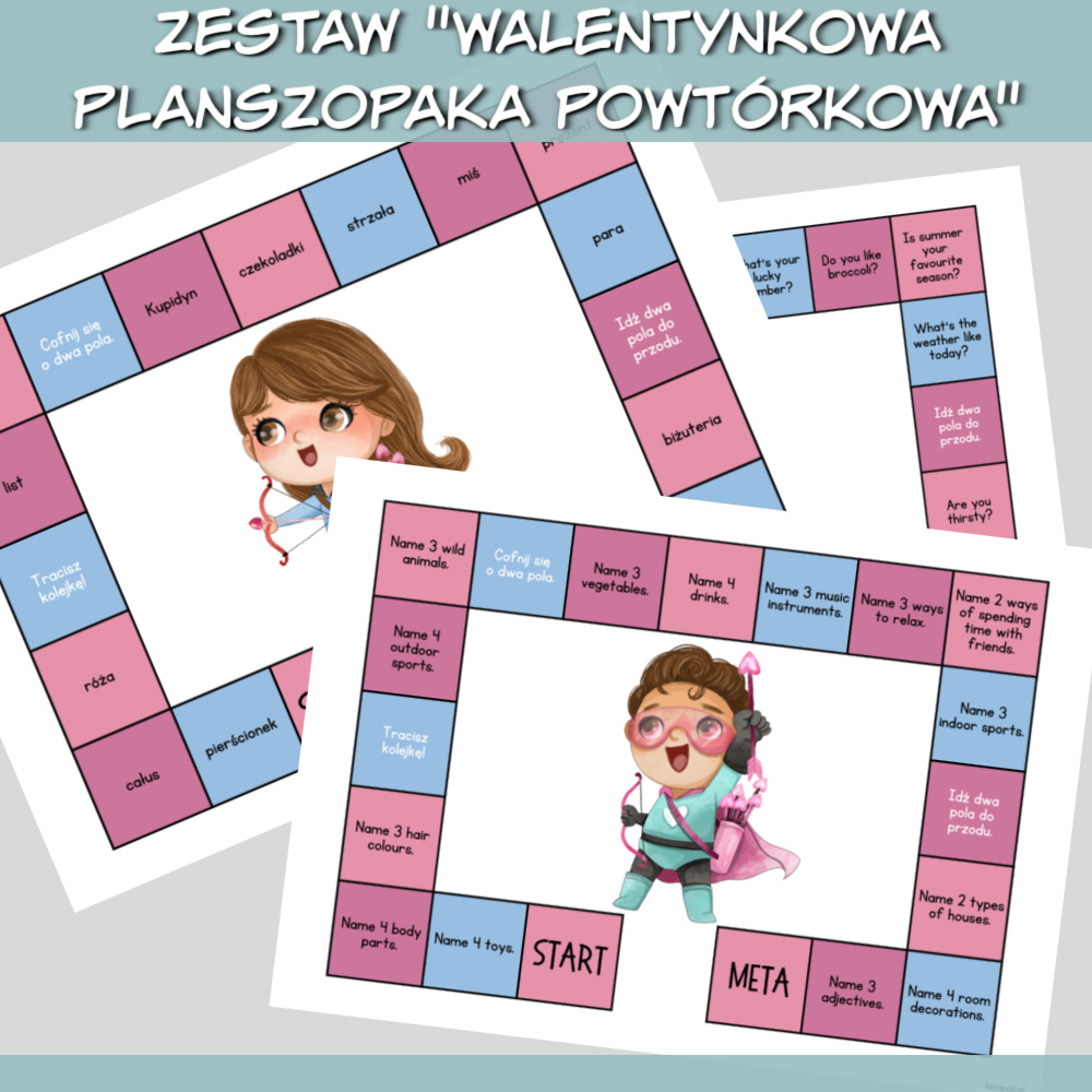 Planszopaka Walentynkowa powtórka to zestaw gier na zajęcia z dziećmi, który sprawdzi się przy utrwaleniu podstawowych zagadnień na zajęciach z języka angielskiego. W zestawie znalazły się gry do powtórki słownictwa z różnych dziedzin, gry do ćwiczenia mówienia w języku angielskim oraz gry z walentynkowym słownictwem. GraPlanszopaka Walentynkowa powtórka najlepiej sprawdzą się na zajęciach indywidualnych i w małych grupach z uczniami z klas 3-6. W przypadku większych grup, możemy podzielić uczniów na drużyny.