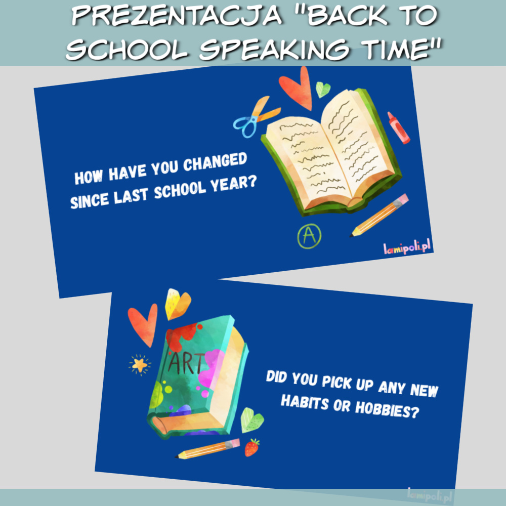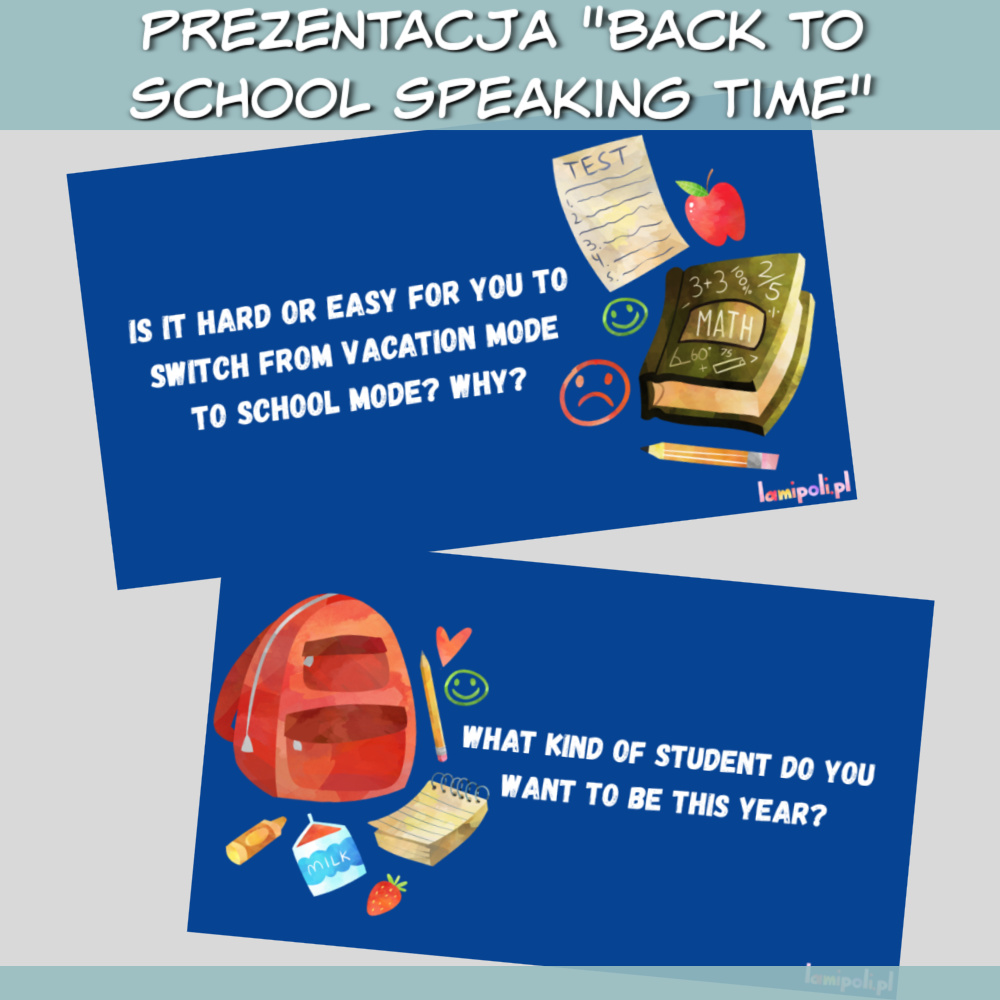 Back to School Speaking Time to angażująca prezentacja PDF stworzona z myślą o lekcjach konwersacyjnych z młodzieżą i dorosłymi. Powrót do szkoły to temat bliski uczniom – budzi emocje, wspomnienia i zachęca do refleksji. Dzięki ciekawym pytaniom i estetycznej oprawie graficznej materiał ułatwia nauczycielowi przeprowadzenie wartościowej lekcji rozwijającej umiejętność mówienia w języku angielskim.