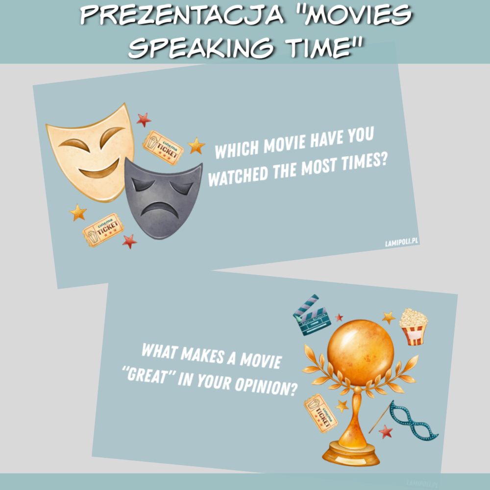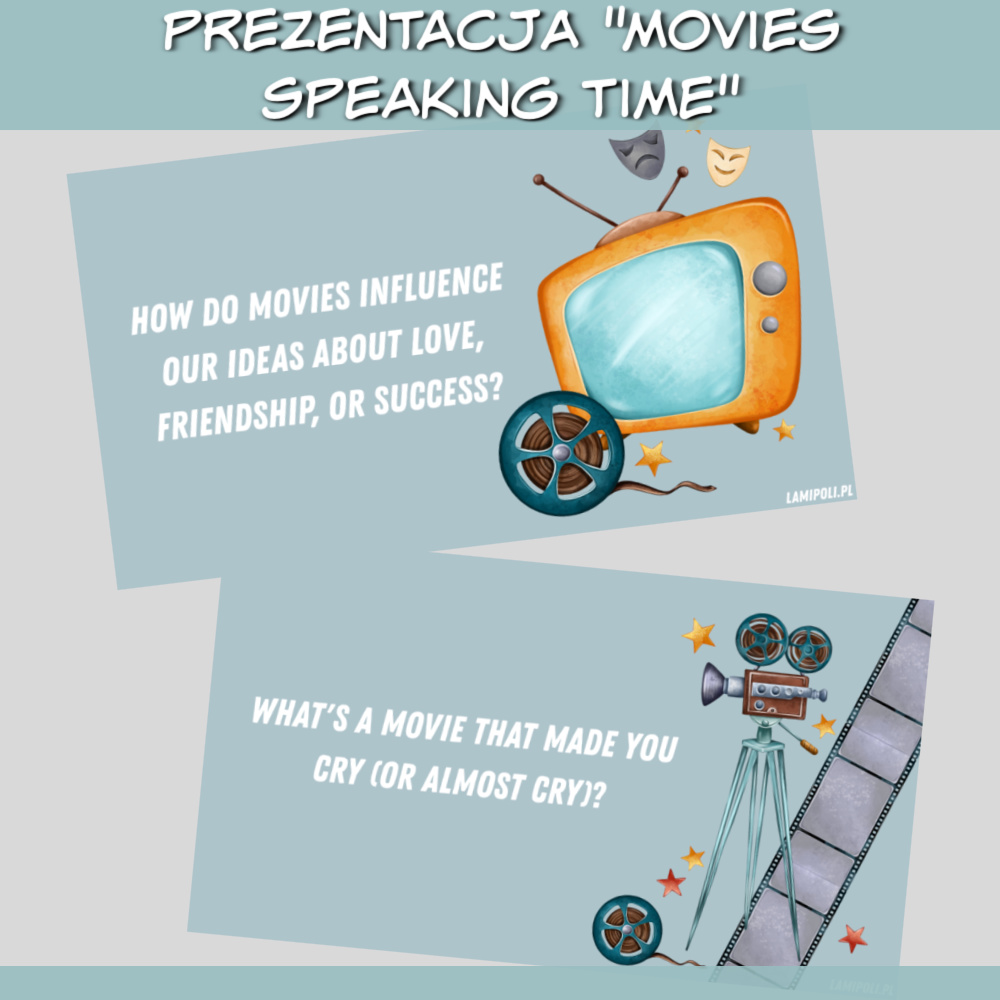 Prezentacja Movies Speaking Time to wyjątkowy materiał dydaktyczny stworzony z myślą o zajęciach konwersacyjnych z młodzieżą i dorosłymi. Temat filmów i kina to doskonały sposób na rozwijanie słownictwa, płynności wypowiedzi oraz swobody komunikacyjnej w języku angielskim. Dzięki atrakcyjnej szacie graficznej i różnorodnym pytaniom lekcje stają się bardziej angażujące i nowoczesne.