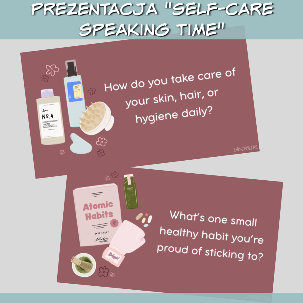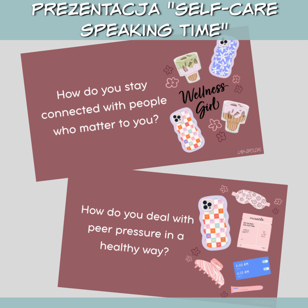 Prezentacja Self-care Speaking Time to inspirujący materiał konwersacyjny stworzony z myślą o zajęciach z młodzieżą i dorosłymi. Temat dbania o siebie porusza ważne i aktualne zagadnienia związane z dobrostanem psychicznym, fizycznym i emocjonalnym. Dzięki różnorodnym pytaniom i estetycznej oprawie graficznej zajęcia nabierają osobistego charakteru i zachęcają do swobodnego mówienia po angielsku.